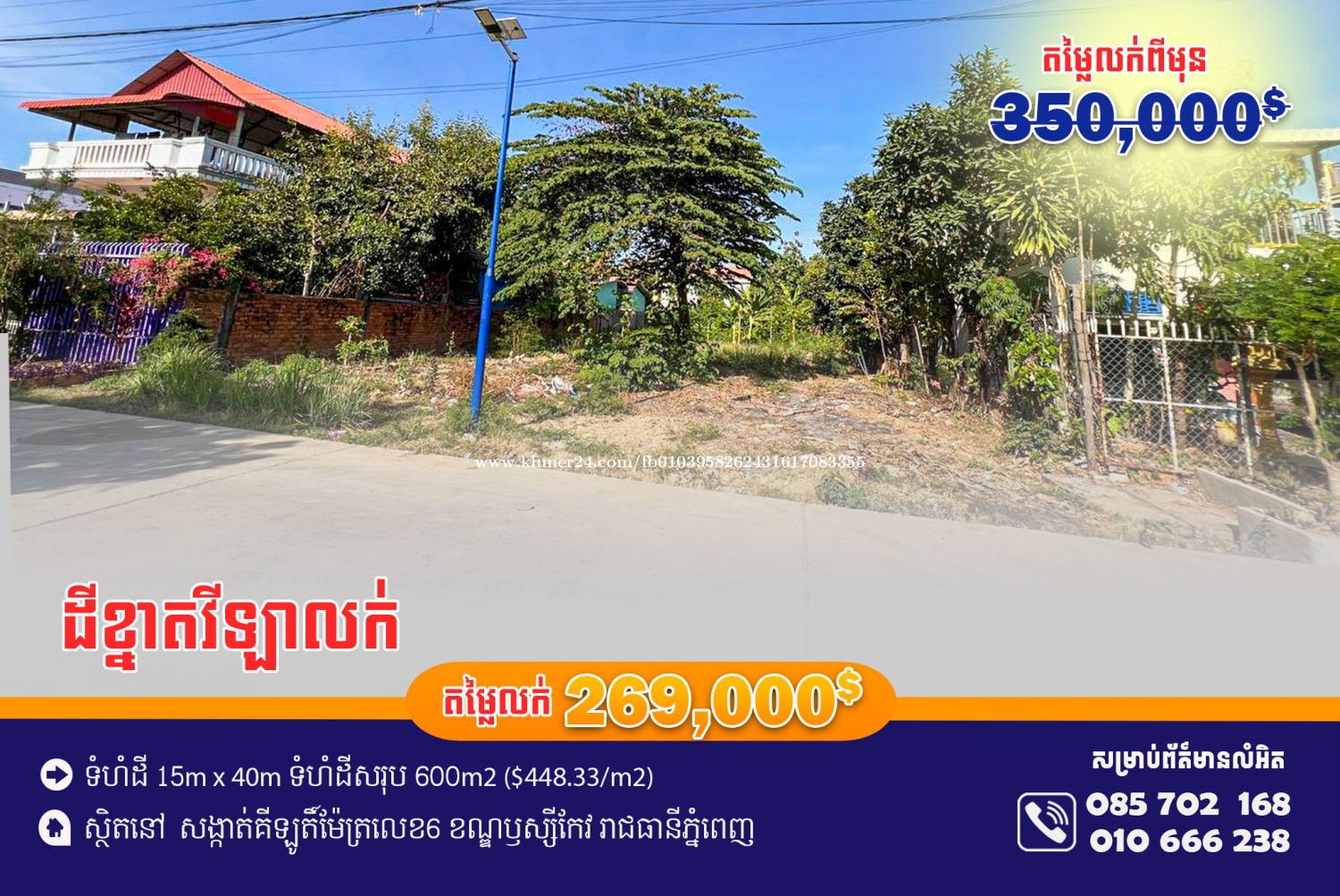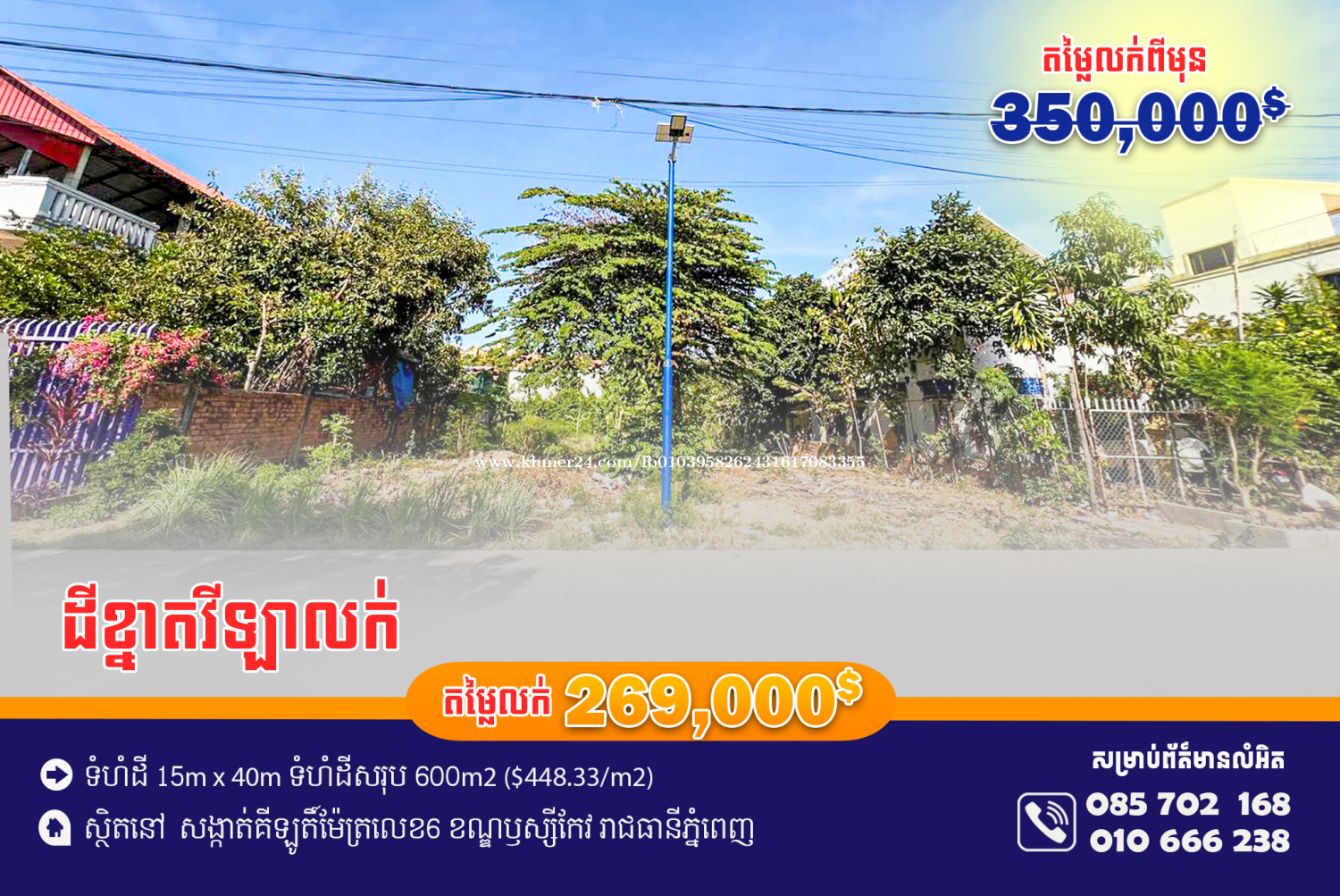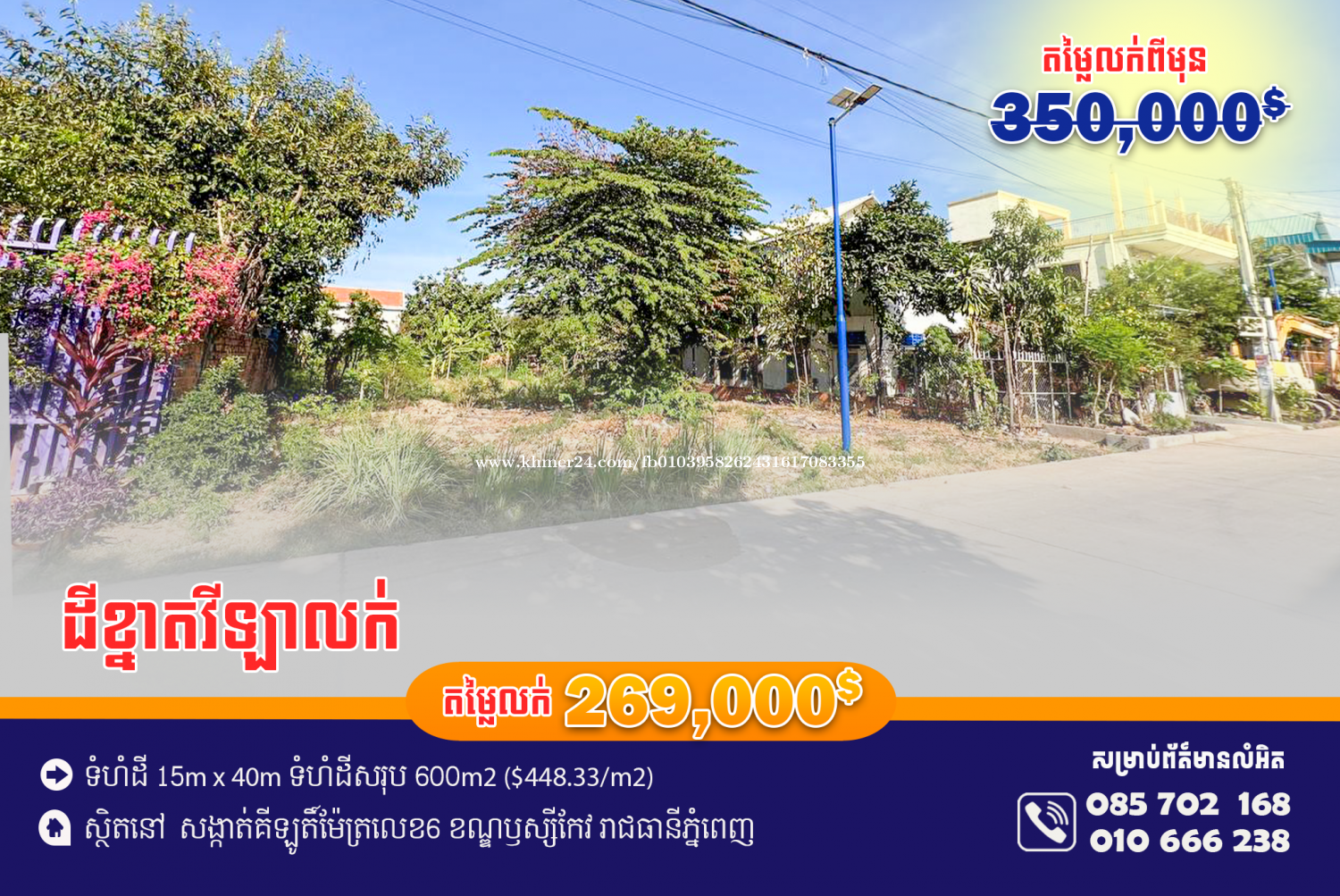 មានដីឡូតិ៍ខ្នាតវីឡាលក់បន្ទាន់ $444.33/m2 ដែលមានទីតាំងស្ថិតនៅជិតផ្លូវ598 ផ្លូវបេតុងទំហំ8M ជាដំបន់រស់នៅស្ងប់ស្ងាត់ល្អ ជិតផ្សារទំនើប សាលារៀនអន្តរជាតិល្បីៗ តាមការវាយតម្លៃនៅដំបន់នោះដី១ម៉ែត្រការ៉េចន្លោះ$900_$1,200 📍ទីតាំងស្ថិនៅជិតសាកលវិទ្យាល័យ អាមេរិកកាំង នឹងបុរីជីបម៉ុង598 សង្កាត់គីឡូតិ៍លេខ6 ខណ្ឌឫស្សីកែវ ភ្នំពេញ ◈━━━━━━━━━━━━◈ តម្លៃលក់| Sale Price $269,000 ចរចា ទំហំដីសរុប 15m x 40m|SQM:600m2 ◈━━━━━━━━━━━━◈ 📍សូមចូលទៅកាន់𝗧𝗲𝗹𝗲𝗴𝗿𝗮𝗺 𝗖𝗵𝗮𝗻𝗻𝗲𝗹ពេលនេះ ដើម្បីស្វែងរកអចលនទ្រព្យពិសេសផ្សេងទៀត៖ 🔗 𝐓𝐞𝐥𝐞. 𝐂𝐡𝐚𝐧𝐧𝐞𝐥:𝗵𝘁𝘁𝗽𝘀://𝘁.𝗺𝗲/𝗦𝗼𝗸𝗵𝗮𝗶𝗥𝗲𝗮𝗹𝘁𝘆 ☎️ 𝗧𝗲𝗹𝗲𝗴𝗿𝗮𝗺:𝟬𝟭𝟬 𝟲𝟲𝟲 𝟮𝟯𝟴 ☎️ 𝗧𝗲𝗹𝗲𝗴𝗿𝗮𝗺:𝟬𝟴𝟱 𝟳𝟬𝟮 𝟭𝟲𝟴