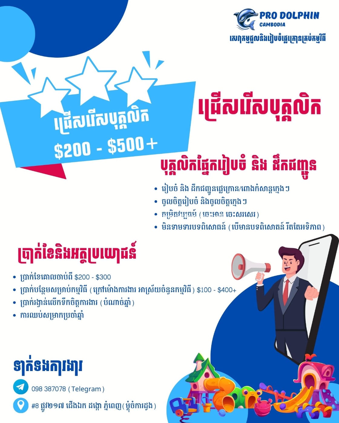 👨💼 ជ្រើសរើសបុគ្គលិក ផ្នែករៀបចំនិងដឹកជញ្ជូន - រៀបចំ និង ដឹកជញ្ជូនផ្លេក្រោន/ពោងកំសាន្តក្មេងៗ - ចូលចិត្តរៀបចំ និងចូលចិត្តក្មេងៗ - កម្រិតវប្បធម៍ (ចេះអាន ចេះសរសេរ) - មិនទាមទារបទពិសោធន៍ (បើមានបទពិសោតន៍ រឹតតែអទិភាព) 💰 $200 - $500+ ប្រាក់ខែនិងអត្ថប្រយោជន៍ - ប្រាក់ខែគោលចាប់ពី $200 - $300 - ប្រាក់បន្ថែមសម្រាប់កម្មវិធី (ក្រៅម៉ោងការងារ អាស្រ័យចំនួនកម្មវិធី) $100 - $400+ - ប្រាក់រង្វាន់លើកទឹកចិត្តការងារ (បំណាច់ឆ្នាំ) - ការឈប់សម្រាកប្រចាំឆ្នាំ 📞 Tel: 098387xxxClick To Call 📍 #8 ផ្លូវ២១៧ ជើងឯក ដង្កោ ភ្នំពេញ(ម្តុំចំការដូង) 📨 Telegram: https://t.me/ProDolphinCambodia