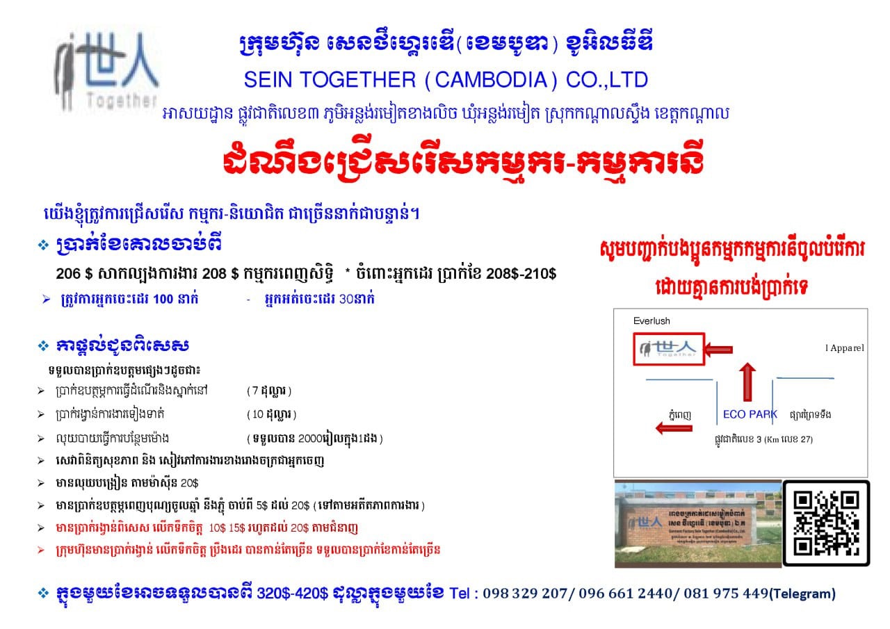 ត្រូវការអ្នកចេះដេរស្រាប់ ចំនួន១០០នាក់ ប្រាក់ខែតាមក្រសួង ហើយនិងមាន ប្រាក់អត្ថប្រយេាជន៍ផ្សេងៗទៀត