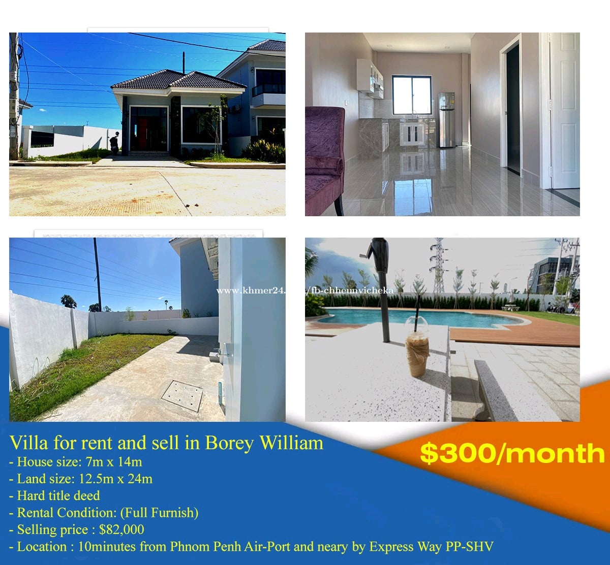 🏡Villa available for rent and sell in Borey William , Sangkat Snor , Khan Kamboul -House size: 7m x 14m -Land size: 12.5m x 24m -Ownership Type:Hard title deed -Rental Price: 300$/month(Full Furnish) -Full price : $82,000 -Selling price:$79,000 -Location:Phnom Penh -Tell: 069487xxxClick To Call/099797xxxClick To Call