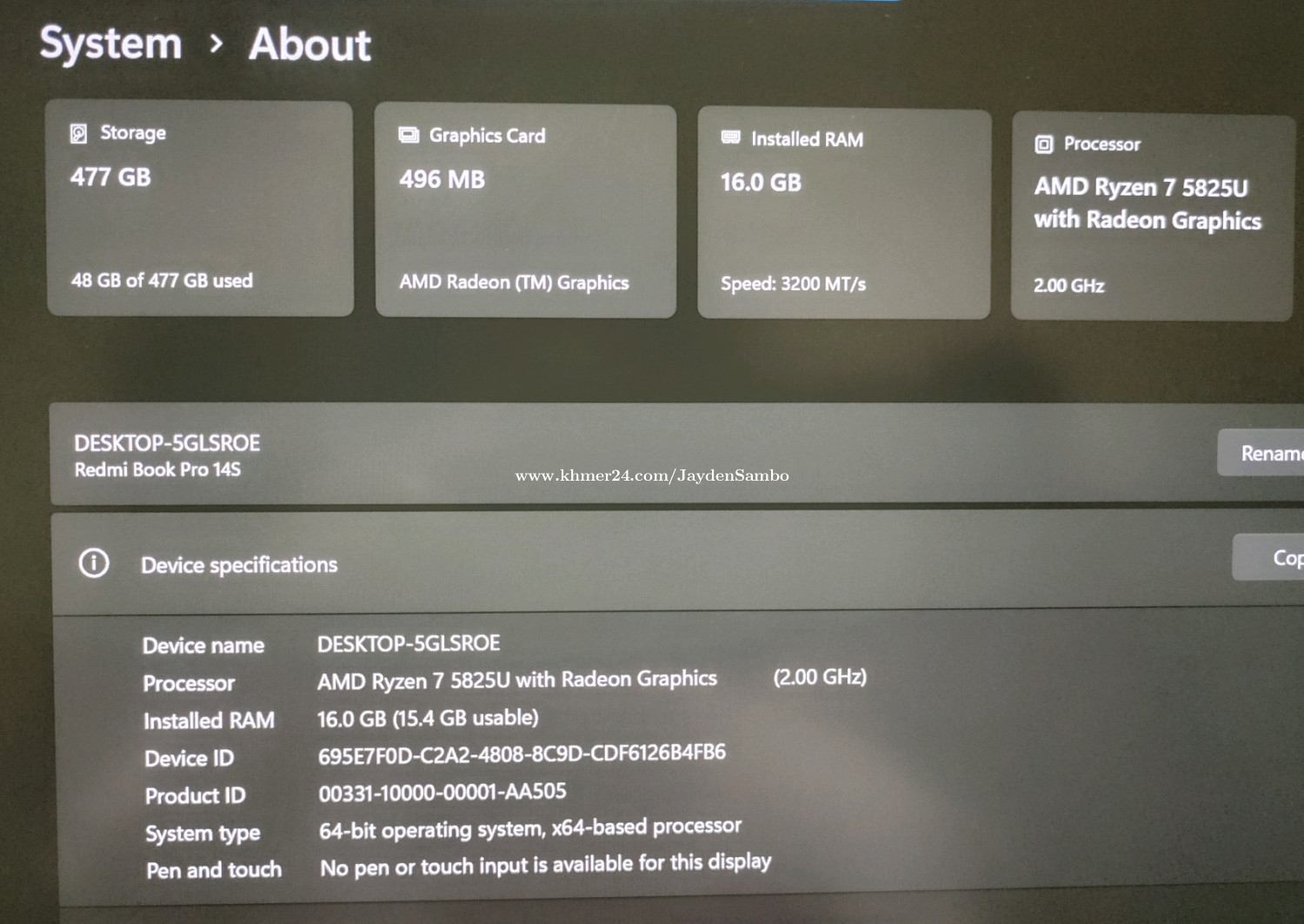 Redmi Book Pro 14S ដូចថ្មី99.7% ស្តើងស្រាលមាំស្រួលដាក់តាមខ្លួនថ្មខ្លាំងតួអាលុយមីញ៉ូម - 14" 2.5K Super retina IPS គែមតូច កញ្ចក់ពណ៍ធម្មជាតិភ្លឺច្បាស់ខ្លាំងការពារភ្នែក - Ryzen 7 5825U 2.0GHz 16cpu up to 4.5 GHz with Radeon Graphic, cache 16MB(similar i7 12th) - RAM 16GB Samsung - 512GB PCIe NVMe - 56Wh battery ថ្មខ្លាំង4-7ម៉ោង battery 4-7hours - Wi-Fi 6 -- Light weight 1.42 kg, - Backlit ឃីភ្លើង - 65W Type-C fast charging original adapter ទាក់ទងtelegram ដើម្បីតបរហ័ស: https://t.me/sambo8686 call 015566xxxClick To Call