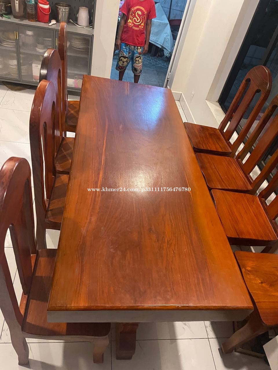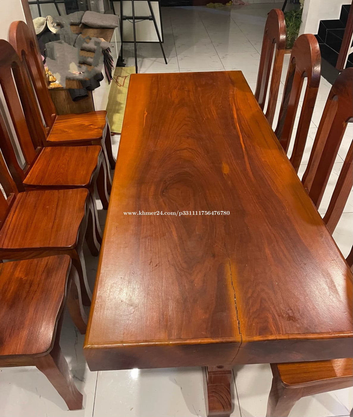 ឈុតតុ កៅអី8 កៅអីឈើបេង តុ ឈើ ផ្ចឹក ទទឺង0.5m បណ្តោយ 2.05m កំរាស់សាច់ឈើ 1តឹក ជើងក្បាច់ មាំ មានស្នាមប្រេះតិច អាចជួសជុលបាន តម្លៃ 750$ កាលទិញ1200$