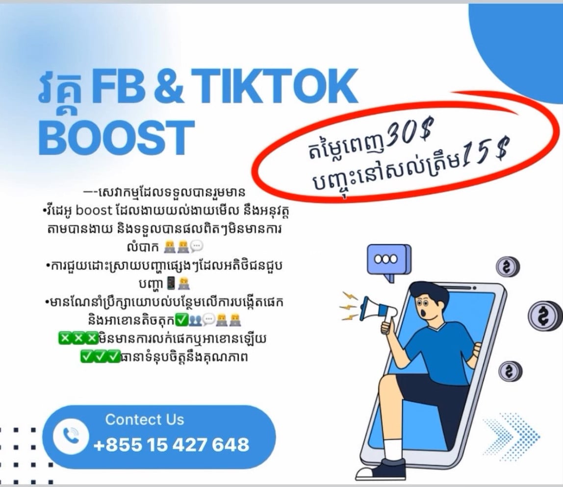 🎁តម្លៃសិក្សាវគ្គ Fb& TikTok Boost ពេញគឺ 30$ ពេលនេះគឺ discount 50% សម្រាប់ 68នាក់ដំបូង 👏នៅសល់ត្រឹមតែ15$ តែប៉ុណ្ណោះ🆘🔥 —-សេវាកម្មដែលទទួលបានរួមមាន •វីដេអូ boost ដែលងាយយល់ងាយមើល នឹងអនុវត្តតាមបានងាយ និងទទួលបានផលពិតៗមិនមានការលំបាក 👨💻👨💻💬 •ការជួយដោះស្រាយបញ្ហាផ្សេងៗដែលអតិថិជនជួបបញ្ហា📱🧑💻 •មានណែនាំប្រឹក្សាយោបល់បន្ថែមលើការបង្កើតផេក និងអាខោនតិចតុក✅👥💬👨💻👨💻 ❎❎❎មិនមានការលក់ផេកឬអាខោនឡើយ ✅✅✅ធានាទំនុបចិត្តនឹងគុណភាព 💳Customer service 24/7🌐🔒 - @Por_GenZ - @ka_Nika_99
