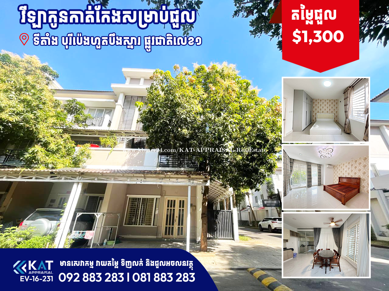 វីឡាកូនកាត់កែងសម្រាប់ជួល | Link House LA Coner For Rent - តម្លៃជួល | Rent Price: $1,300 - ទំហំផ្ទះ | House Size: 45mx12m - បន្ទប់គេង | Bedroom: 4 - បន្ទប់ទឹក | Bathroom: 5 - បែរទិសត្បូង | South -ទីតាំង/ Location: បុរីប៉េងហួតបឹងស្នោរ, សង្កាត់វាលស្បូវ, ខណ្ឌច្បារអំពៅ, រាជធានីភ្នំពេញ ។ Tel: 092883xxxClick To Call l 081883xxxClick To Call Telegram Chat : https://t.me/katappraisalsupport Telegram Channel : https://t.me/KAT_APPRAISAL