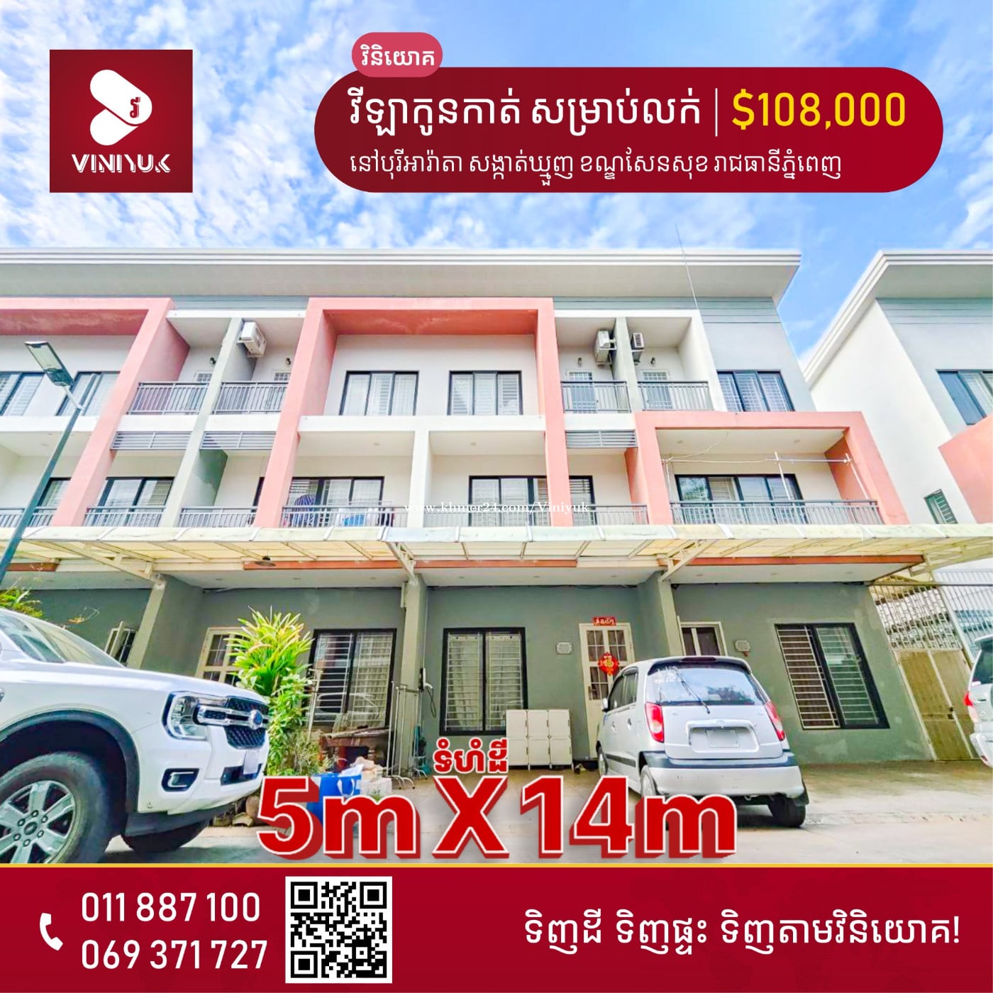 🏡វីឡាកូនកាត់ សម្រាប់លក់!! 📍ទីតាំង ៖ នៅបុរីអារ៉ាតា សង្កាត់ឃ្មួញ ខណ្ឌសែនសុខ រាជធានីភ្នំពេញ - តម្លៃលក់: $108,000 ចរចា - ទំហំដី: 5m x 14 m - ទំហំផ្ទះ: 5m x 8m - បន្ទប់គេង3, បន្ទប់ទឹក3 - សម្ភារៈមិនមាន - ទិស ជើង - ប្លង់ រឹង - លេខអាជ្ញាប័ណ្ណ : E-22-404