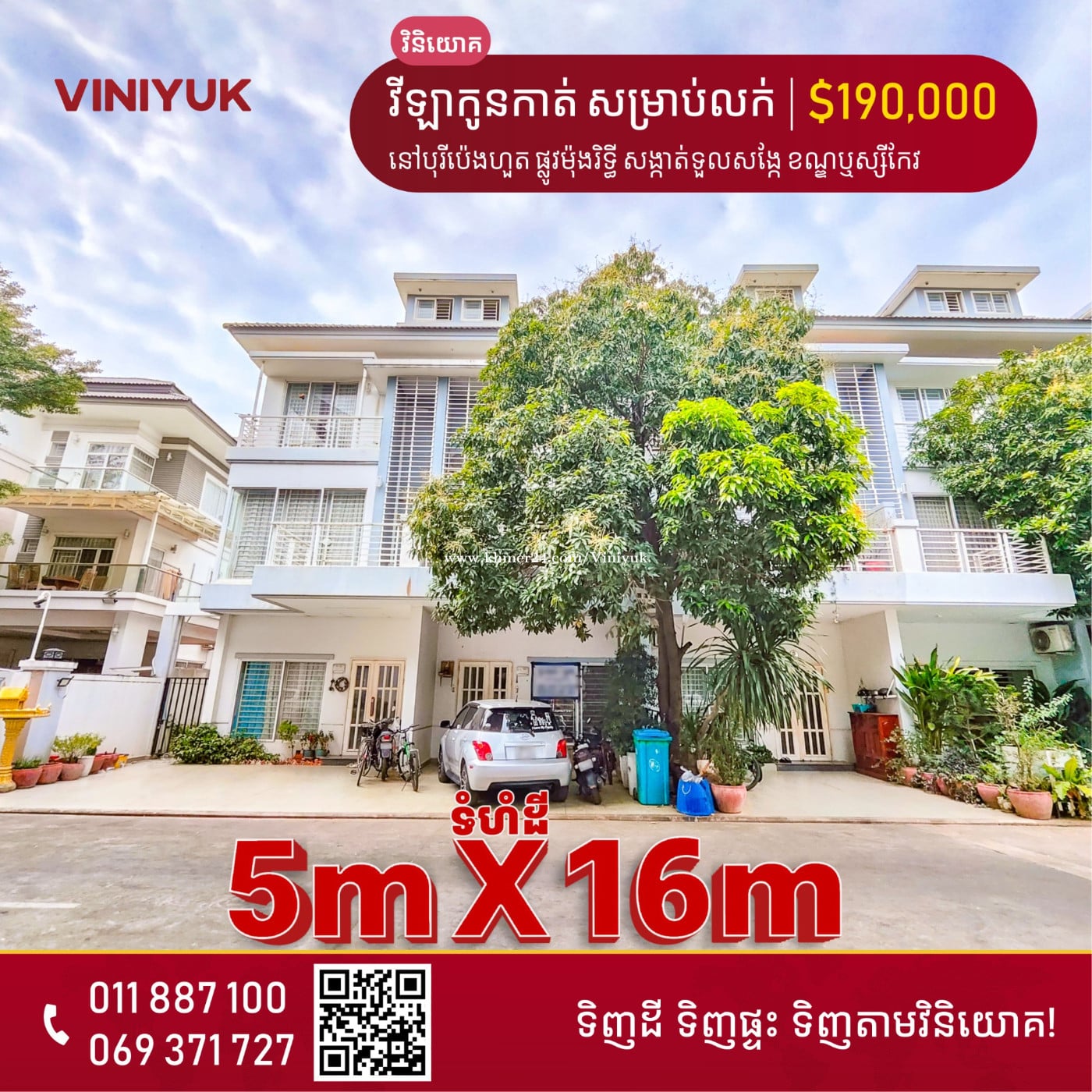 🏡វីឡាកូនកាត់ សម្រាប់លក់!! 📍ទីតាំង ៖ នៅបុរីប៉េងហួត ផ្លូវម៉ុងរិទ្ធី សង្កាត់ទួលសង្កែ ខណ្ឌឬស្សីកែវ រាជធានីភ្នំពេញ - តម្លៃលក់: $190,000 ចរចា - ទំហំដី: 5m x16m - ទំហំផ្ទះ: 5m x 12m - បន្ទប់គេង4, បន្ទប់ទឹក5 - ទិស កើត - ប្លង់ រឹង - លេខអាជ្ញាប័ណ្ណ : E-22-404