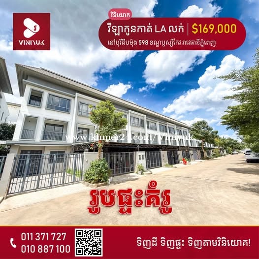 🏡វីឡាកូនកាត់ LA សម្រាប់លក់!! 📍ទីតាំង ៖ នៅបុរីជីបម៉ុង 598 ខណ្ឌឫស្សីកែវ រាជធានីភ្នំពេញ - តម្លៃលក់: $169,000 (ចរចា) - ទំហំផ្ទះ: 5m X 13.7m - ទំហំដី: 5m X 23m (115m²) - បន្ទប់គេង: 4 , បន្ទប់ទឹក: 5 - ទិសបែរខាងលិច - ផ្ទេរកម្មសិទ្ធិនៅបុរីជូនអតិថិជន - លេខអាជ្ញាប័ណ្ណ : E-22-404