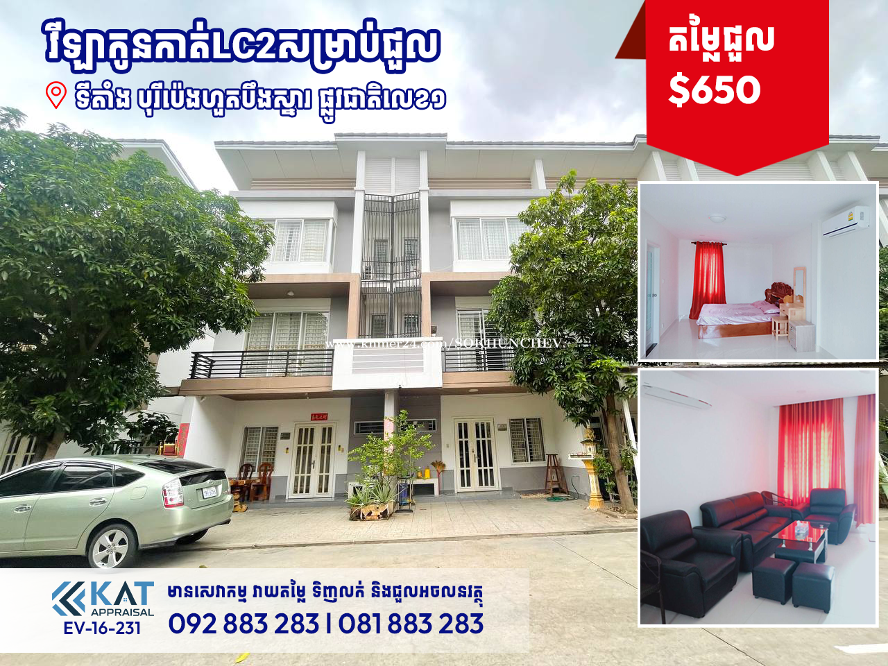 វីឡាកូនកាត់LC2 សម្រាប់ជួល l Link house LC2 For Rent -តម្លៃជួល | Rent Price: $650 -ទំហំដី | Land Size: 5.3m x 14.7m - ទំហំផ្ទះ | house Size: 5.3mx7.2m -បន្ទប់គេង | Bedroom: 3 -បន្ទប់ទឹក | Bathroom: 4 -សំភារះប្រើប្រាស់មានពេញl l Fully furnished - ទីតាំង/ Location: បុរីប៉េងហួតបឹងស្នោរ, សង្កាត់និរោធ, ខណ្ឌច្បារអំពៅ, រាជធានីភ្នំពេញ។ Tel: 092883xxxClick To Call l 081883xxxClick To Call Telegram Chat : https://t.me/katappraisalsupport Telegram Channel : https://t.me/KAT_APPRAISAL