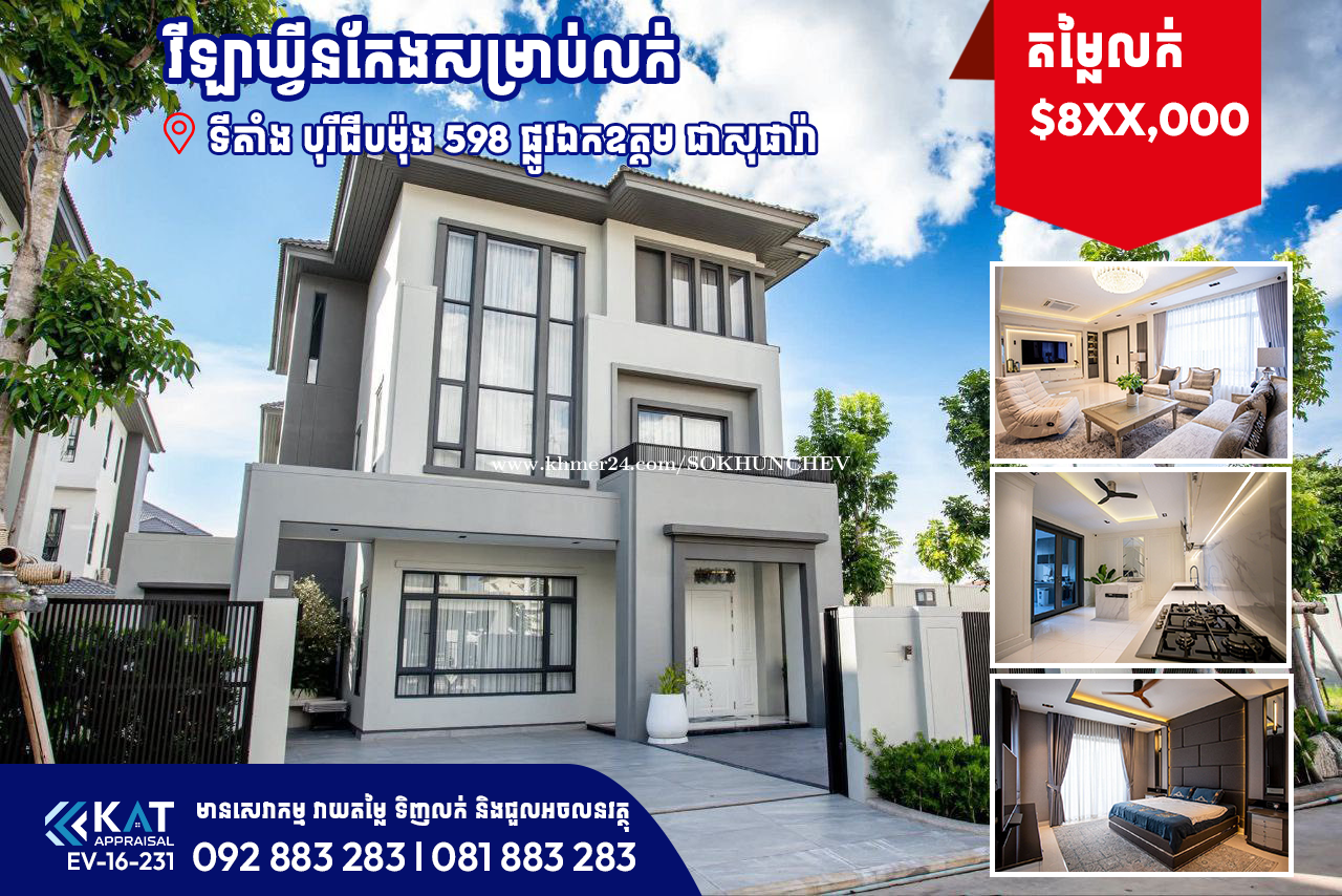 វីឡាឃ្វីនកែងសម្រាប់លក់/ Queen Villa For Sale - តំលៃ : 8xx,000$ ចរចា - ទំហំផ្ទះ : 9m x 13m - ទំហំដី : 16 x 25m - បន្ទប់គេង 4 - បន្ទប់ទឹក 6 - ទីតាំង : បុរីជីបម៉ុង 598 ( ផ្លូវឯកឧត្តម ជាសុផារ៉ា ) Tel: 092883xxxClick To Call l 081883xxxClick To Call Telegram Chat : https://t.me/katappraisalsupport Telegram Channel : https://t.me/KAT_APPRAISAL