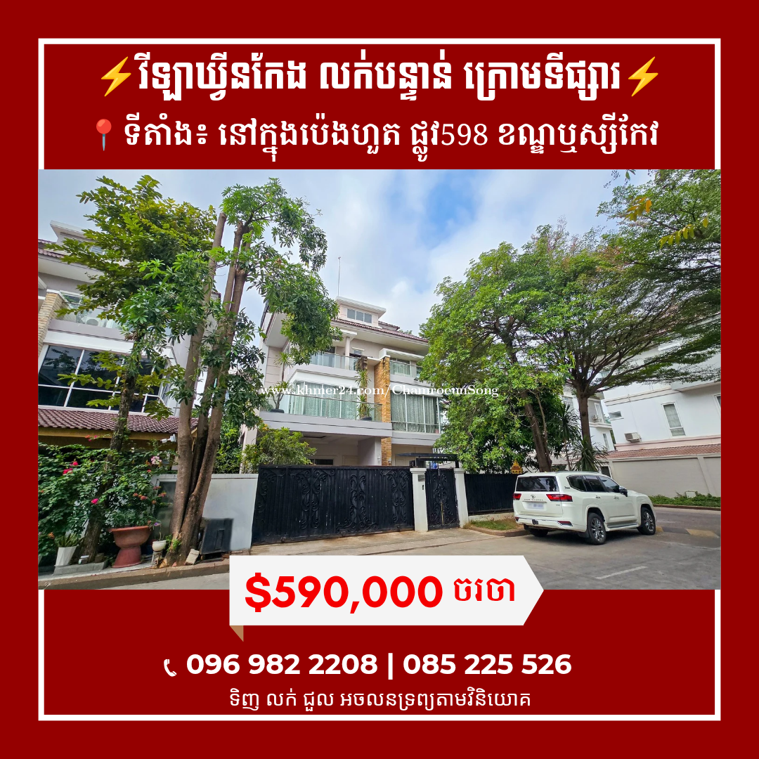 វីឡាឃ្វីនកែង លក់បន្ទាន់(តម្លៃក្រោមទីផ្សារ)!! 📍ទីតាំង: នៅក្នុងបុរីប៉េងហួត 𝐓𝐡𝐞 𝐒𝐭𝐚𝐫 𝐏𝐫𝐞𝐦𝐢𝐞𝐫 ផ្លូវ𝟓𝟗𝟖 ខណ្ឌឬស្សីកែវ - តម្លៃលក់ : $𝟓𝟗𝟎,𝟎𝟎𝟎 ចរចា - ទំហំដីៈ 𝟏𝟔𝐦 𝐱 𝟐𝟑𝐦 - ទំហំផ្ទះៈ 𝟏𝟐𝐦 𝐱 𝟏𝟎𝐦 - បន្ទប់គេង: 𝟖 , បន្ទប់ទឹក: 𝟖 - ផ្ទះបាយ , កន្លែងទទួលភ្ញៀវ , ការិយាល័យ, ស្កាយបារ - ផ្ទះមានកំពស់ 𝟒ជាន់ - លេខអាជ្ញាប័ណ្ណ : 𝐄-𝟐𝟐-𝟒𝟎𝟒 📲សម្រាប់ព័ត៌មានលម្អិត ៖ 𝟎𝟗𝟔𝟗𝟖𝟐𝟐𝟐𝟎𝟖 | 𝟎𝟖𝟓𝟐𝟐𝟓𝟓𝟐𝟔 📲សម្រាប់ព័ត៌មានលម្អិត ៖ 0969822xxxClick To Call | 085225xxxClick To Call Telegram: https://t.me/Chamroeun_Song ⭐️ 𝐉𝐨𝐢𝐧 𝐓𝐞𝐥𝐞𝐠𝐫𝐚𝐦 𝐂𝐡𝐚𝐧𝐧𝐞𝐥 https://t.me/chamroeun_viniyuk សូមអរគុណ!! ---------------------------------------- #ផ្ទះវីឡាភ្លោះ #ខណ្ឌឬស្សីកែវ #បុរីប៉េងហួត598 #សង្កាត់ច្រាំងចំរេះទី2 #វិនិយោគ