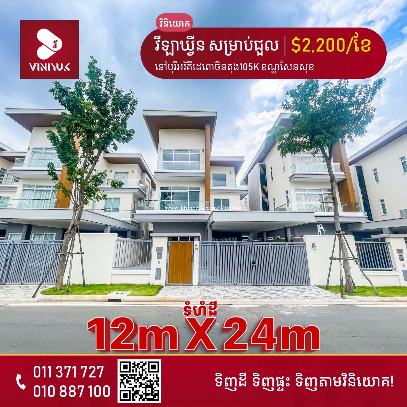 🏡វីឡាឃ្វីន សម្រាប់ជួល !! 📍ទីតាំង ៖ នៅបុរីអរ័គីដេពោចិនតុង105K ខណ្ឌសែនសុខ រាជធានីភ្នំពេញ - តម្លៃ ជួល : $2,200/ខែ - ទំហំដី : 12m x 24m - ទំហំផ្ទះ : 8m x 14m - បន្ទប់គេង5 បន្ទប់ទឹក 6 - ផ្ទះបាយ 1 , កន្លែងទទួលភ្ញៀវ 1 - ផ្ទះថ្មី ពីបុរី - សម្ភរៈ គ្រប់ - លេខអាជ្ញាប័ណ្ណ : E-22-404