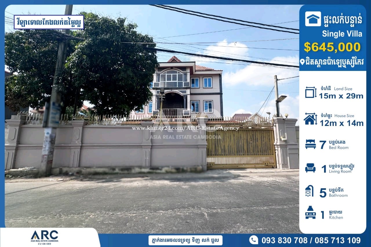 #Single Villa For Sale at Borey Villa Toul Sangkae #វីឡាទោលកែងលក់បន្ទាន់នៅជិតស្ពានប៉ាឡេ ( ខណ្ឌឬស្សីកែវ ) 🔹 តម្លៃលក់ក្រោមទីផ្សារ : $645,000 (ចរចាម្ចាស់ផ្ទាល់) 🔹 កាត់ឈ្មោះប្លង់រឹងជូន 🔹 ទំហំដី : 15m x 29m 🔹 ទំហំផ្ទះ : 12m x 14m 🔹 បន្ទប់គេង : 07 បន្ទប់ទឹក : 05 📍ទីតាំងស្ថិតនៅសង្កាត់ឬស្សីកែវ,ខណ្ឌឬស្សីកែវ ,រាជធានីភ្នំពេញ សម្រាប់ពត៏មានលម្អិតសូមទំនាក់ទំនងមកក្រុមការងារ 085713xxxClick To Call / 093830xxxClick To Call / 0978899xxxClick To Call Chat to Telegram Agent https://t.me/sonsela14 Channel Telegram https://t.me/ARCKhanResseykeo 👉 អាជ្ញាប័ណ្ណ៖ EV-08-069