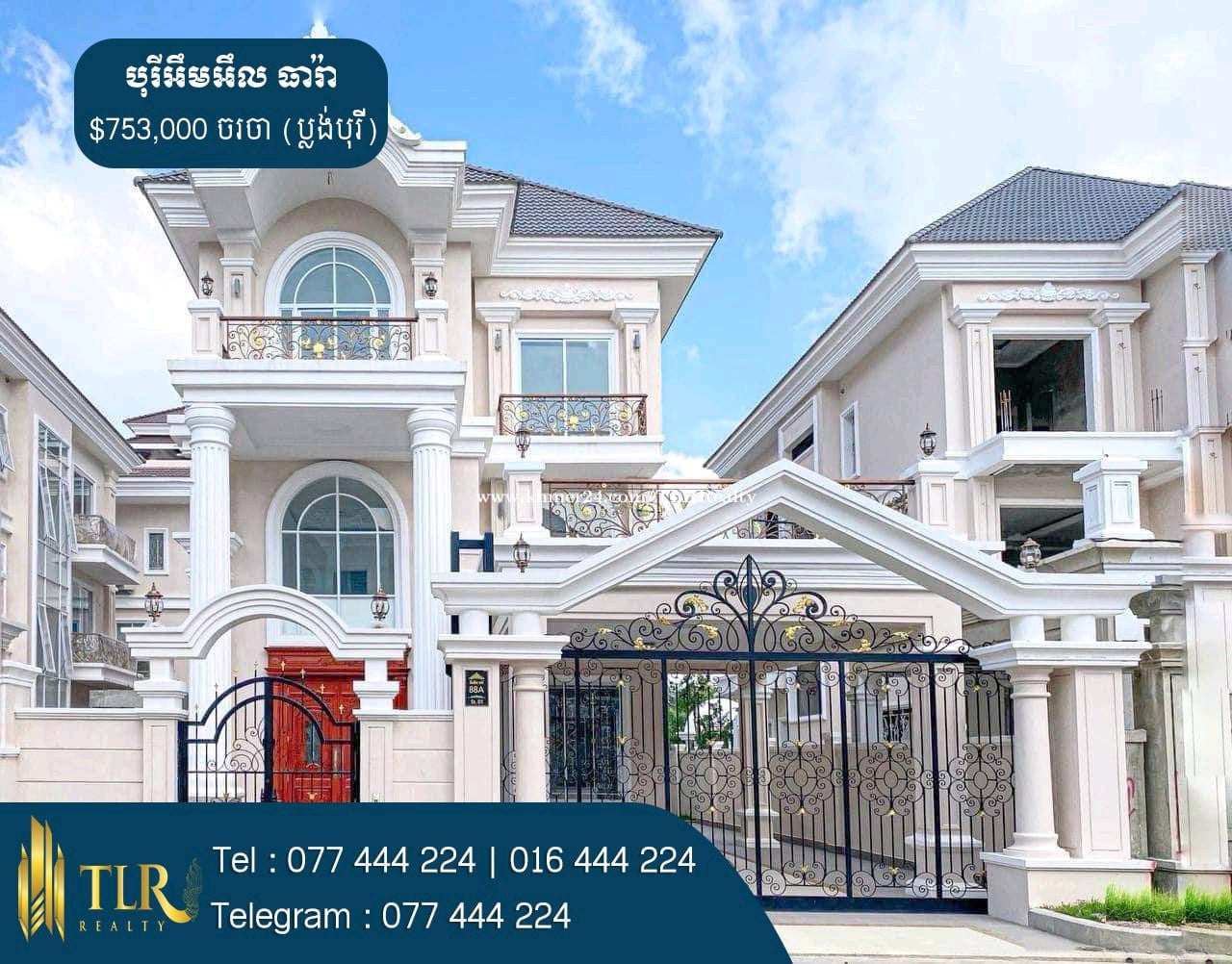 🏡វីឡាទោលព្រីនស៏ A សម្រាប់លក់ | Villa Prince A for Sale 💲តម្លៃលក់ | Price Sale : $753,000 ចរចា (ប្លង់បុរី) - ទំហំផ្ទះ | House Size : 9m x 15m - ទំហំដី | Land Size : 15m x 25m - បន្ទប់គេង | Bedroom : 5 - បន្ទប់ទឹក | Bathroom : 6 - ផ្ទះបាយ | Kitchen : 2 - បន្ទប់ទទួលភ្ញៀវ | Livingroom : 1 - ផ្ទះបែរទៅខាងត្បូង | Facing to South 📍ទីតាំងស្ថិតនៅក្នុង បុរីអឹមអឹល ធារ៉ា សង្កាត់កំពង់សំណាញ់ ក្រុងតាខ្មៅ ខេត្តកណ្តាល | Location in Borey ML Tiara Sangkat Kampong Samnanh Krong Ta Khmau Kandal Province. # អត្តលេខអាជ្ញាប័ណ្ណ : E-24-449 📞 Cellcard : 077444xxxClick To Call 📞 Smart : 016444xxxClick To Call 📞 Metfone : 066444xxxClick To Call 📱 Telegram : 077444xxxClick To Call 📱 Channel telegram : https://t.me/RithyTLR
