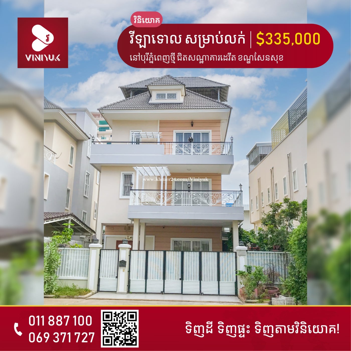 🏡វីឡាទោល សម្រាប់លក់ !! 📍ទីតាំង ៖ បុរីភ្នំពេញថ្មី ជិតសណ្ឋាគារដេវិត ខណ្ឌសែនសុខ រាជធានីភ្នំពេញ - តម្លៃលក់: $335,000 ចរចា - ទំហំដី : 11.5m x 22m - ទំហំផ្ទះ : 7.5m x 12m - បន្ទប់គេង 4 បន្ទប់ទឹក 6 - បន្ទប់បុគ្គលិក 1 - កាត់ប្លង់រឹងជូន - ទិសត្បូង - លេខអាជ្ញាប័ណ្ណ : E-22-404