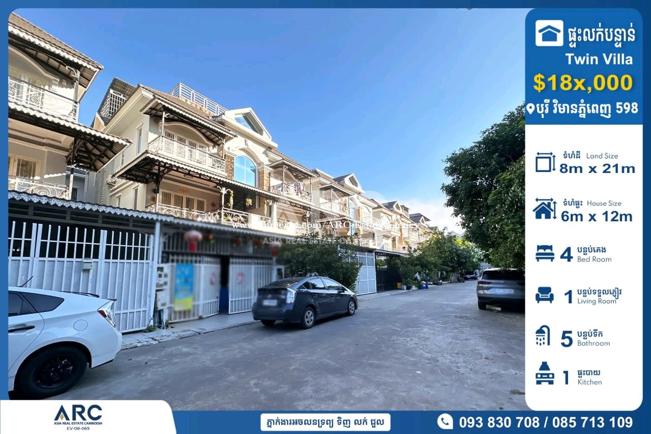 #Twin VIlla For Sale at Borey Vimean Phnom Penh 598 #វីឡាភ្លោះលក់បន្ទាន់នៅក្នុងបុរី វិមានភ្នំពេញ 598 ជិតផ្សារទំនេីបអុីអន២ 🔹 តម្លៃលក់ក្រោមទីផ្សារ : $18x,000 (ចរចម្ចាស់ផ្ទាល់) 🔹 កាត់ឈ្មោះប្លង់រឹងជូន 🔹 ទំហំផ្ទះ : 6m x 12m 🔹 ទំហំដី : 8m x 21m 🔹 បន្ទប់គេង : 04 បន្ទប់ទឹក : 05 📍ទីតាំងត្រឹមតែ07នាទីពីផ្សារទំនើប AEON Mall2 សង្កាត់ច្រាំងចំរេះទី១ ,ខណ្ឌឬស្សីកែវ ,រាជធានីភ្នំពេញ សម្រាប់ពត៏មានលម្អិតសូមទំនាក់ទំនងមកក្រុមការងារ 085713xxxClick To Call / 093830xxxClick To Call / 0978899xxxClick To Call Chat to Telegram Agent https://t.me/sonsela14 Channel Telegram https://t.me/ARCKhanResseykeo 👉 អាជ្ញាប័ណ្ណ៖ EV-08-069