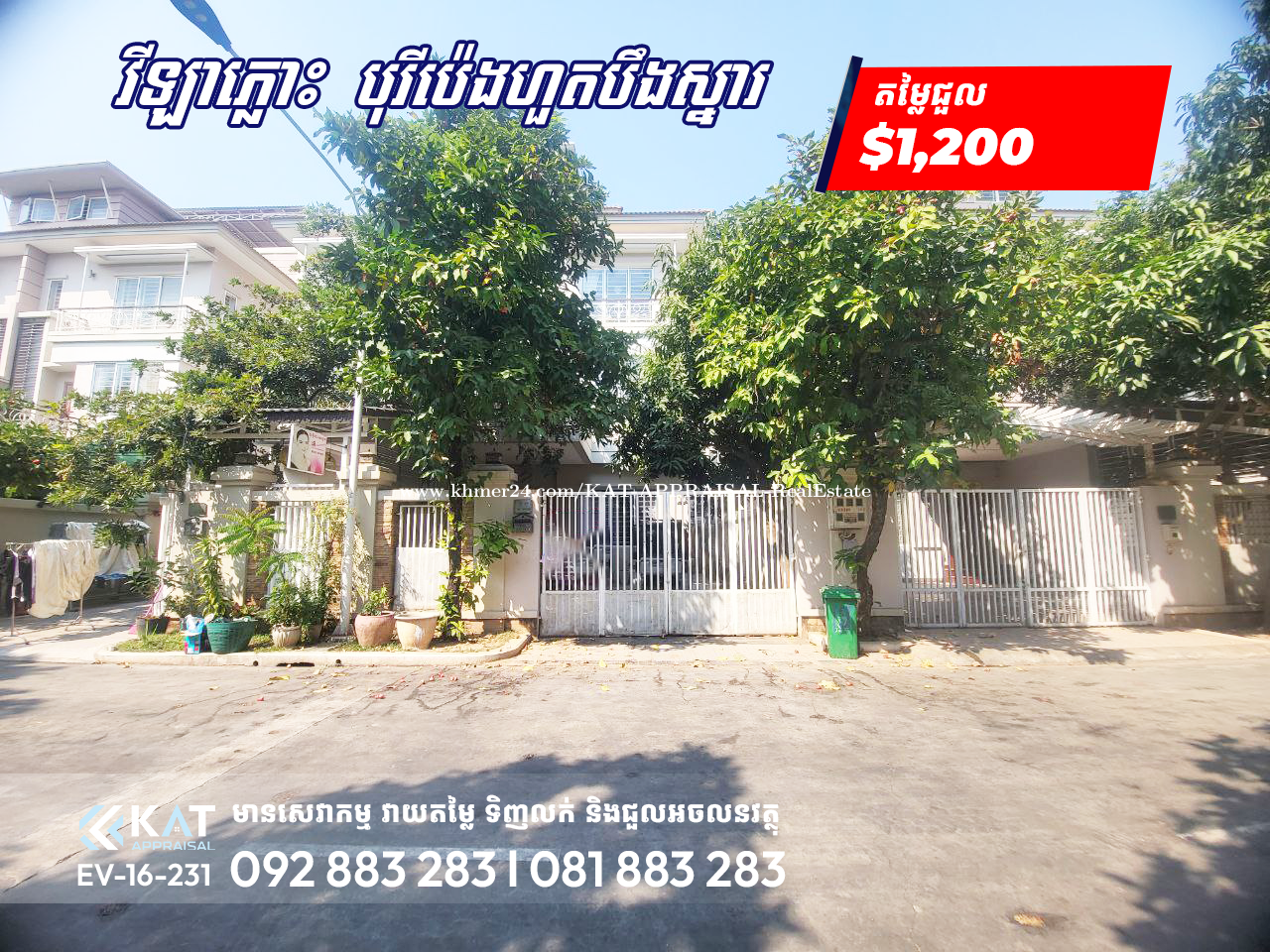 វីឡាភ្លោះសម្រាប់ជួល | Twin A Villa For Rent - តម្លៃជួល | Rent Price: $1,200 /1ខែ - ទំហំផ្ទះ | House Size: 6m x 12m -ទំហំដី | Land Size : 8mx21m - បន្ទប់គេង | Bedroom: 4 - បន្ទប់ទឹក | Bathroom: 5 - មានឥវាន់ពេញ - កុងត្រា១ឆ្នាំ (កក់២ខែ បង់១ខែ) -សំភារ:ពេញ -ទីតាំង/ Location: បុរីប៉េងហួតបឹងស្នោ សង្កាត់និរោធន៍ ខណ្ឌច្បារអំពៅ Tel: 092883xxxClick To Call l 081883xxxClick To Call Telegram Chat : https://t.me/katappraisalsupport Telegram Channel : https://t.me/KAT_APPRAISAL