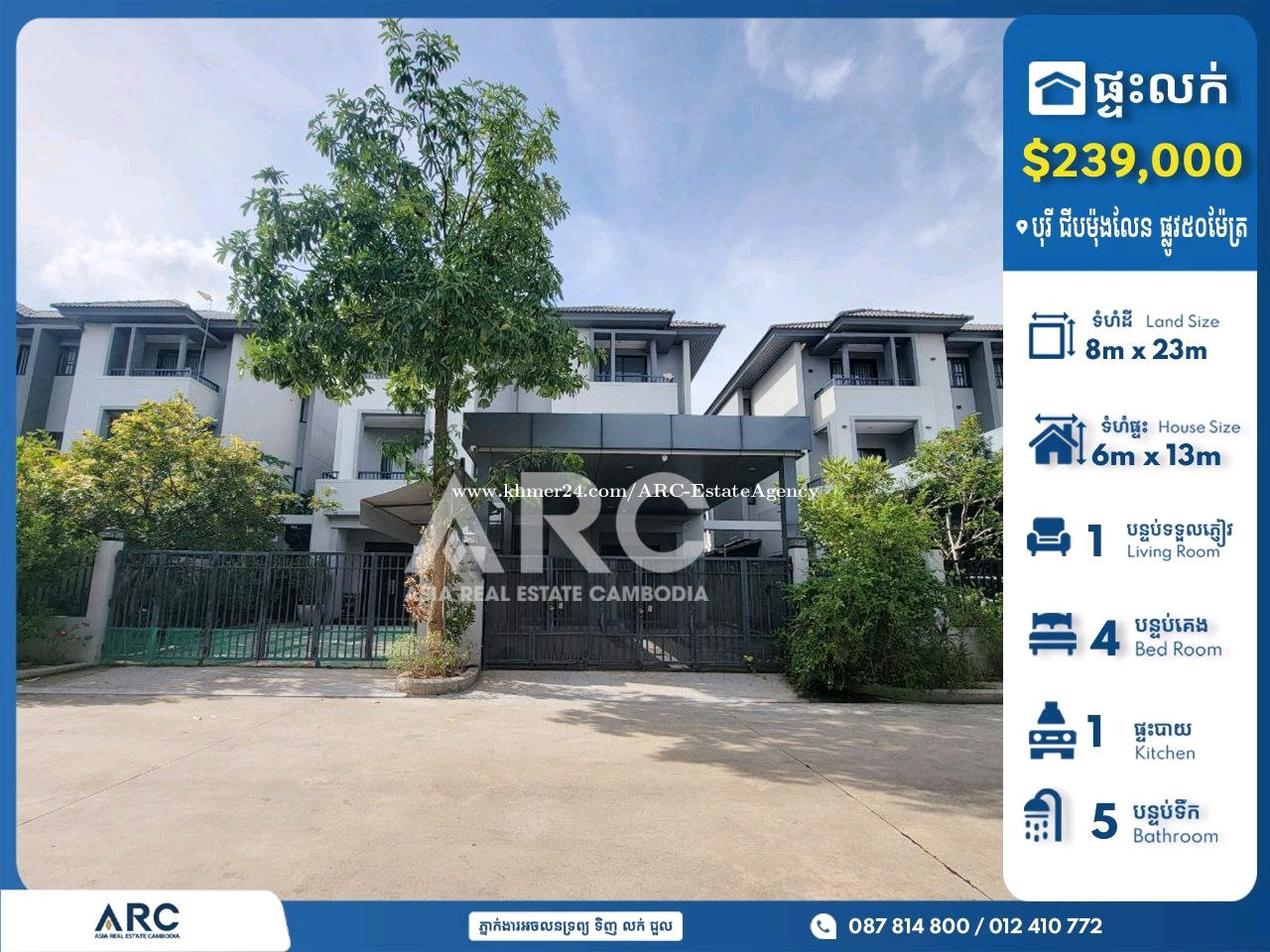 🏘️ វីឡាភ្លោះ(Twin Villa) សម្រាប់លក់នៅបុរី ជីបម៉ុងលែន (ផ្លូវ៥០ម៉ែត្រ) *តម្លៃ: 239,000$(ចរចា) *ទំហំផ្ទះ Size House: 6m x 13m *ទំហំដី Size Land: 8m x23m *បន្ទប់គេង Bedroom: 4 *បន្ទប់ទឹក Bathroom: 5 👉ផ្ទេរកម្មសិទ្ធិ(ប្លង់រឹងជូន) 👉ផ្ទះថ្មីស្អាត ១០នាទីពីផ្សារទំនើបអុីអន៣ ១៥ពីប្រលានយន្តហោះថ្មី មានសន្តិសុខ២៤ម៉ោង មានផាសុខភាព សុវត្ថិភាព 📍 នៅសង្កាត់ព្រៃស ខណ្ឌដង្កោ រាជធានីភ្នំពេញ Tel: 087814xxxClick To Call / 012410xxxClick To Call /070410xxxClick To Call Telegram http://t.me/@Vebol087 Channel Telegram https://t.me/ARCDangkorVebol Channel telegram: https://t.me/AsiaRealEstateCambodia #ផ្ទះលក់បន្ទាន់ខ្លាំង #villaforsale #KhanDangkao #khanmeanchey 👉អាជ្ញាប័ណ្ណ:EV-08-069