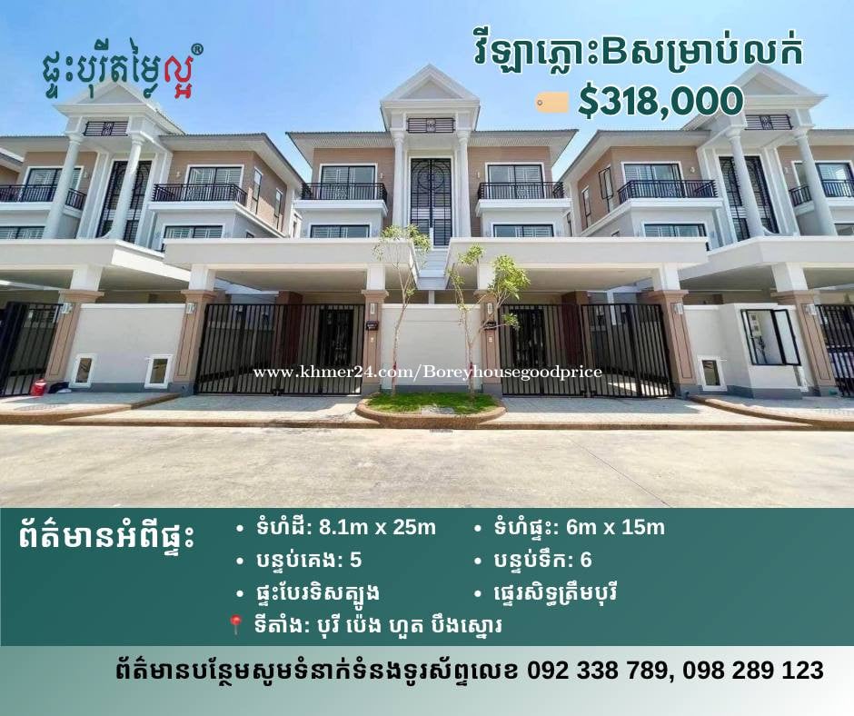 វីឡាភ្លោះ B Twin Villaសម្រាប់លក់ -ទីតាំង បុរី ប៉េង ហួត បឹងស្នោរ -តម្លៃលក់ l Sale Price : $ 318,000 -ទំហំដី : 8.1m x 25m -ទំហំផ្ទះ : 6m x 15m -បន្ទប់គេង 05, បន្ទប់ទឹក 06 -ផ្ទះបែរទិសត្បូង - សម្រាប់ព័ត៌មានបន្ថែម: 092338xxxClick To Call, 098289xxxClick To Call - Telegram Chat : https://t.me/Boreyhousegoodprice - Telegram Channel : https://t.me/boreyhou
