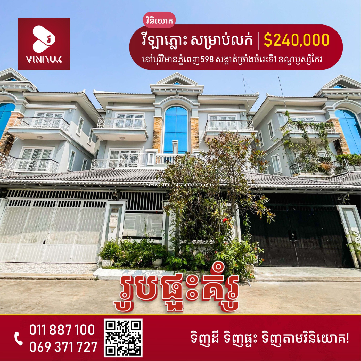 🏡វីឡាភ្លោះ សម្រាប់លក់!! 📍ទីតាំង ៖ នៅបុរីវិមានភ្នំពេញ គម្រោងទី8 សង្កាត់ច្រាំងចំរេះទី1 ខណ្ឌឬស្សីកែវ រាជធានីភ្នំពេញ - តម្លៃលក់ : $240,000 ចរចា - ទំហំដី : 7.5m x 21m - ទំហំផ្ទះ : 6m x 12m - បន្ទប់គេង 4, បន្ទប់ទឹក 5 - ប្លង់បុរី - ទិសបែរត្បូង - លេខអាជ្ញាប័ណ្ណ : E-22-404