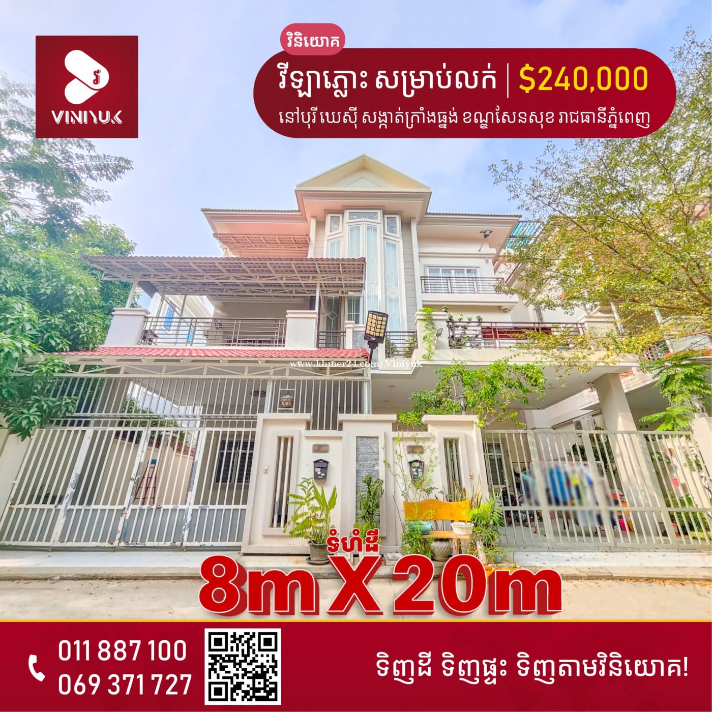🏡វីឡាភ្លោះ សម្រាប់លក់!! 📍ទីតាំង៖ នៅបុរីឃេសុី ជិតបុរីអ័រគីដេ105K សង្កាត់ក្រាំងធ្នង់ ខណ្ឌសែនសុខ រាជធានីភ្នំពេញ - តម្លៃលក់: $240,000 ចរចា - តម្លៃជួល : $850/ខែ ចរចា - ទំហំដី: 8m x 20m - ទំហំផ្ទះ: 6m x 12m - បន្ទប់គេង4, បន្ទប់ទឹក5 - ទិស ត្បូង - សម្ភារៈ ពេញ - កាត់ ប្លង់រឹង - ទល់មុខបុរីអ័រគីដេ105K - លេខអាជ្ញាប័ណ្ណ : E-22-404 📲សូមធ្វើការទំនាក់ទំនង ៖ 011887xxxClick To Call | 069371xxxClick To Call