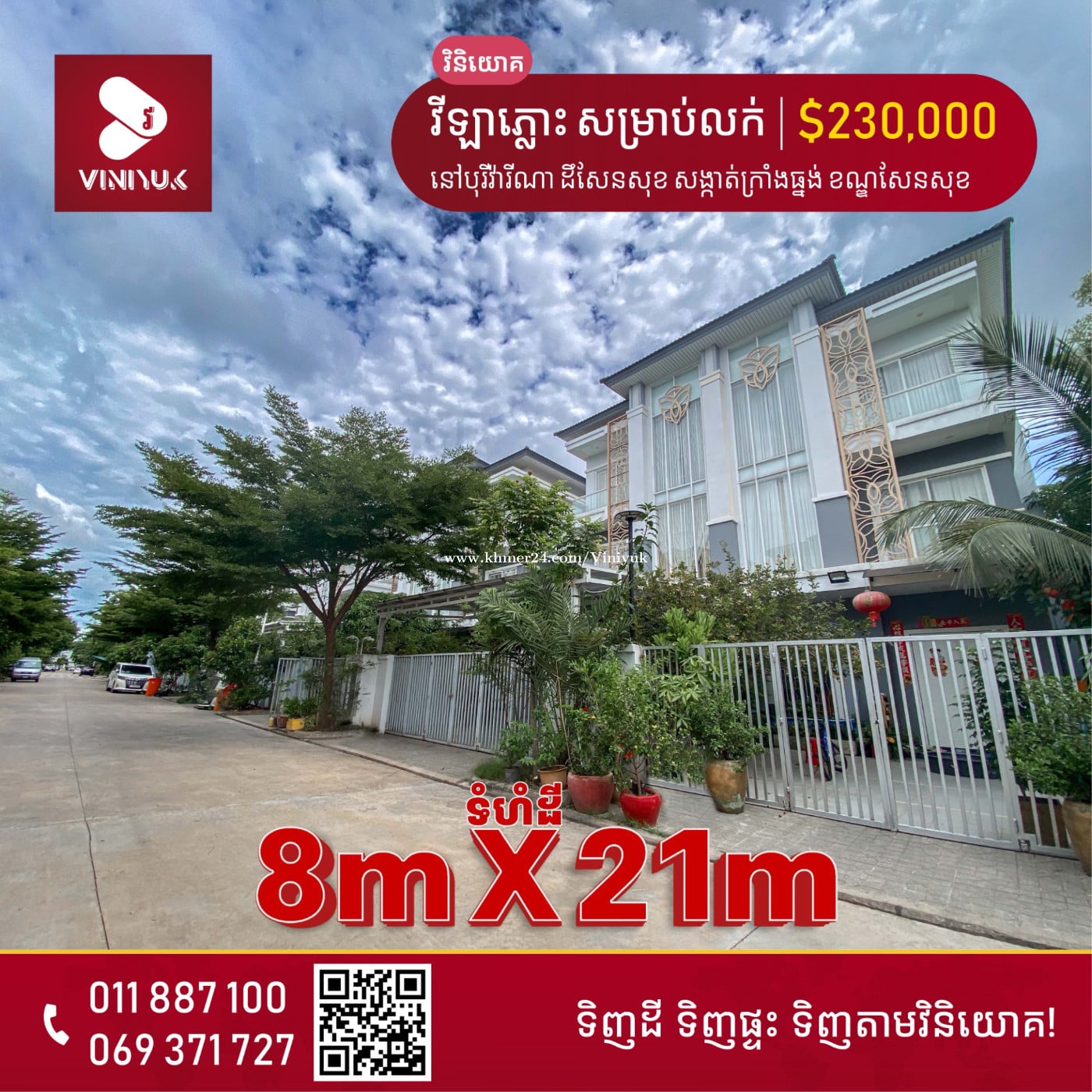 🏡វីឡាភ្លោះ សម្រាប់លក់/ជួល!! 📍ទីតាំង ៖ នៅបុរីវ៉ារីណា ដឹសែនសុខ សង្កាត់ក្រាំងធ្នង់ ខណ្ឌសែនសុខ - តម្លៃលក់ : $230,000 ចរចា - តម្លៃជួល : $1,500/ខែ - ទំហំដី : 8m x 21m - ទំហំផ្ទះ : 6m x 12m - បន្ទប់គេង 4, បន្ទប់ទឹក 5 - លេខអាជ្ញាប័ណ្ណ : E-22-404