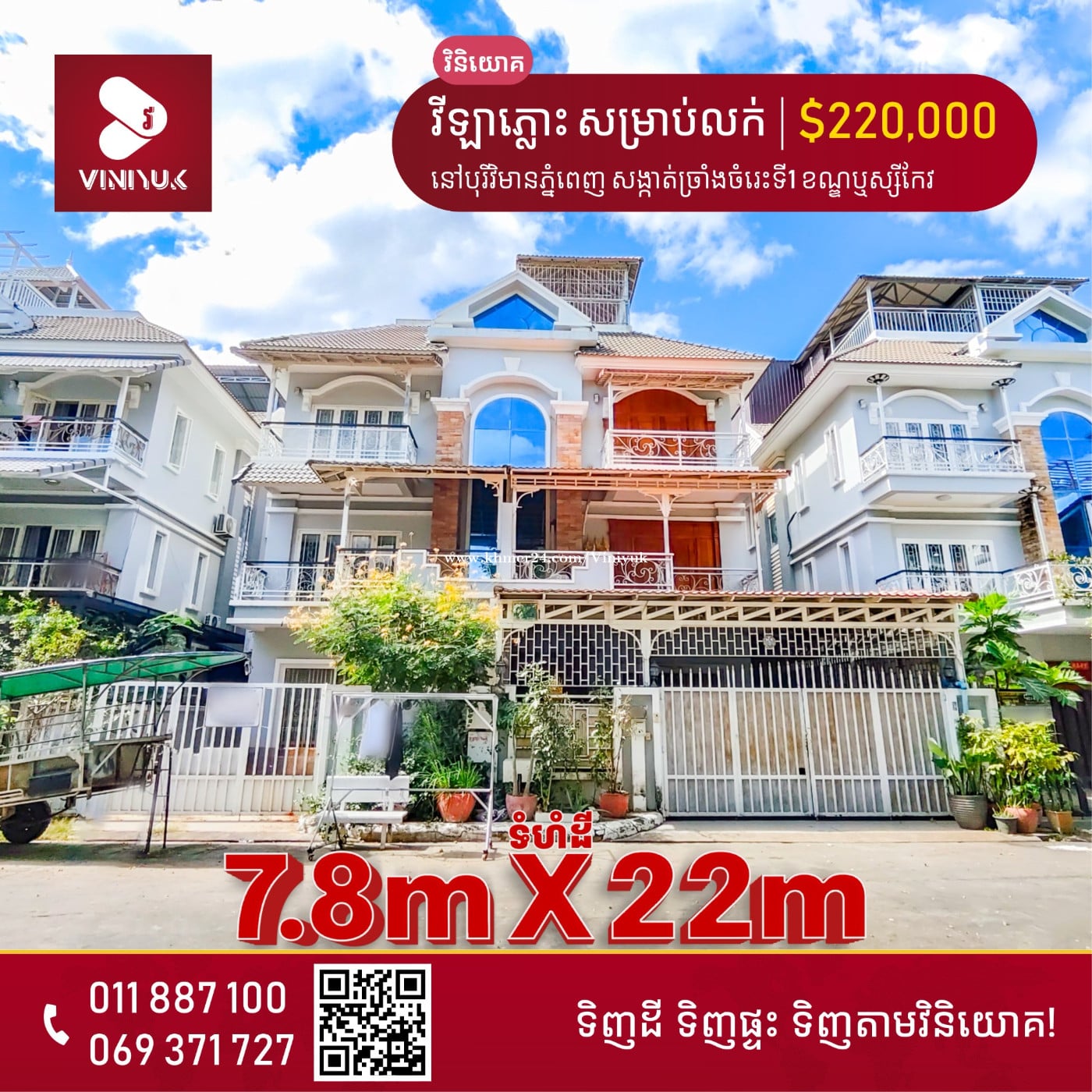 🏡វីឡាភ្លោះ សម្រាប់លក់!! 📍ទីតាំង ៖ នៅបុរីវិមានភ្នំពេញ គម្រោងទី2 សង្កាត់ច្រាំងចំរេះទី1 ខណ្ឌឬស្សីកែវ រាជធានីភ្នំពេញ - តម្លៃលក់: $220,000 ចរចា - ទំហំដី: 7.8m x 22m - ទំហំផ្ទះ: 6m x 12m - បន្ទប់គេង4, បន្ទប់ទឹក5 - ប្លង់ រឹង - ទិស កើត - លេខអាជ្ញាប័ណ្ណ : E-22-404