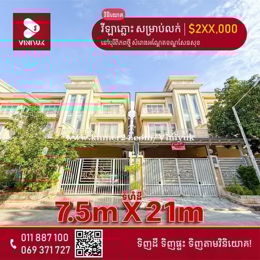 🏡វីឡាភ្លោះ សម្រាប់លក់ !! 📍ទីតាំង ៖ នៅបុរីពិភពថ្មី សំរោងអណ្តែត ខណ្ឌសែនសុខ - តម្លៃ ៖ $2XX,000 (ចរចា) - ទំហំផ្ទះ ៖ 6m x 12m - ទំហំដី ៖ 7.5m x 21m - បន្ទប់គេង 4 , បន្ទប់ទឹក 5 - កាត់ប្លង់រឹងជូន - ផ្ទះថ្មីស្អាត
