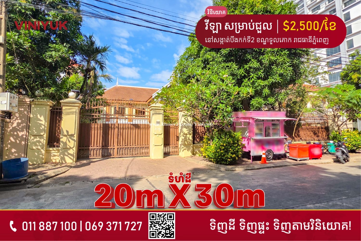 🏡វីឡា សម្រាប់ជួល!! 📍ទីតាំង ៖ នៅសង្កាត់បឹងកក់ទី2 ខណ្ឌទួលគោក រាជធានីភ្នំពេញ - តម្លៃជួល៖ $2,500/ខែ ចរចា - ទំហំដី ៖ 20m x 30m - មានបន្ទប់ 6 , បន្ទប់ទឹក 7 - មានអាងហែលទឹក - កុងត្រាជួល 2- 5ឆ្នាំ - លេខអាជ្ញាប័ណ្ណ : E-22-404