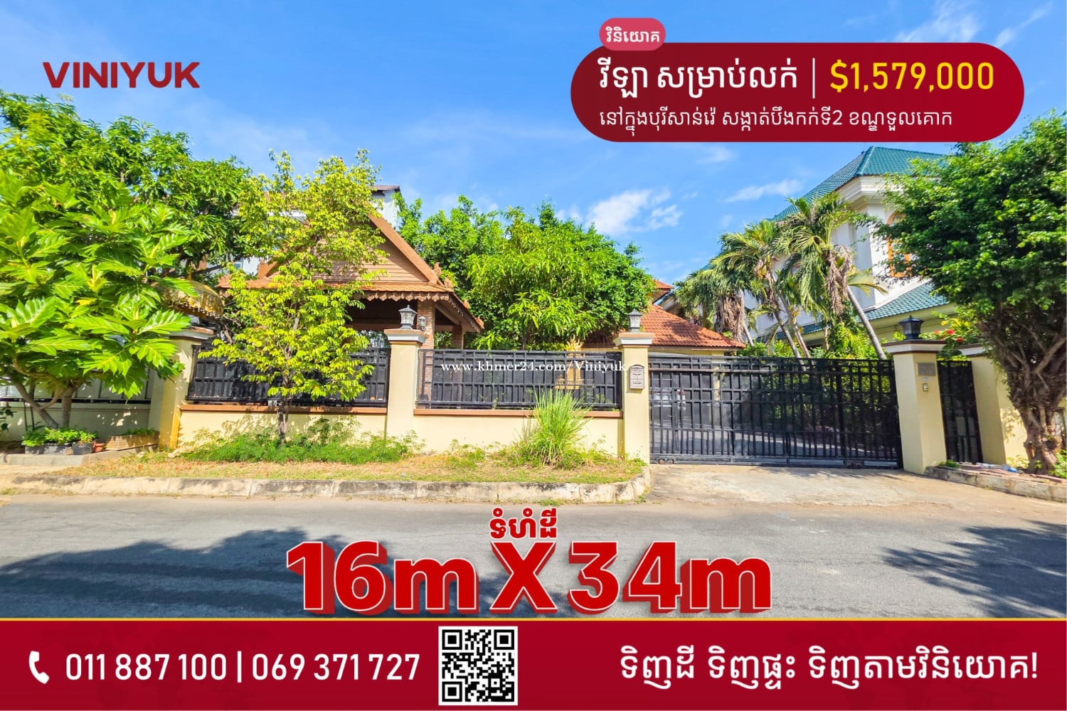 🏡វីឡា សម្រាប់លក់!! 📍ទីតាំង ៖ នៅក្នុងបុរីសាន់វ៉េ សង្កាត់បឹងកក់ទី2 ខណ្ឌទួលគោក រាជធានីភ្នំពេញ - តម្លៃលក់ ៖ $1,579,000 (ចរចា) - ទំហំដី៖ 16m x 34m - ទំហំផ្ទះ៖ 11m x 16m (សល់មុខ៖ 10m, ក្រោយ៖ 4m) - បន្ទប់គេង 6 , បន្ទប់ទឹក 7 - ប្លង់រឹង - ទ្រព្យបែរមុខទៅទិស៖ ត្បូង - លេខអាជ្ញាប័ណ្ណ : E-22-404
