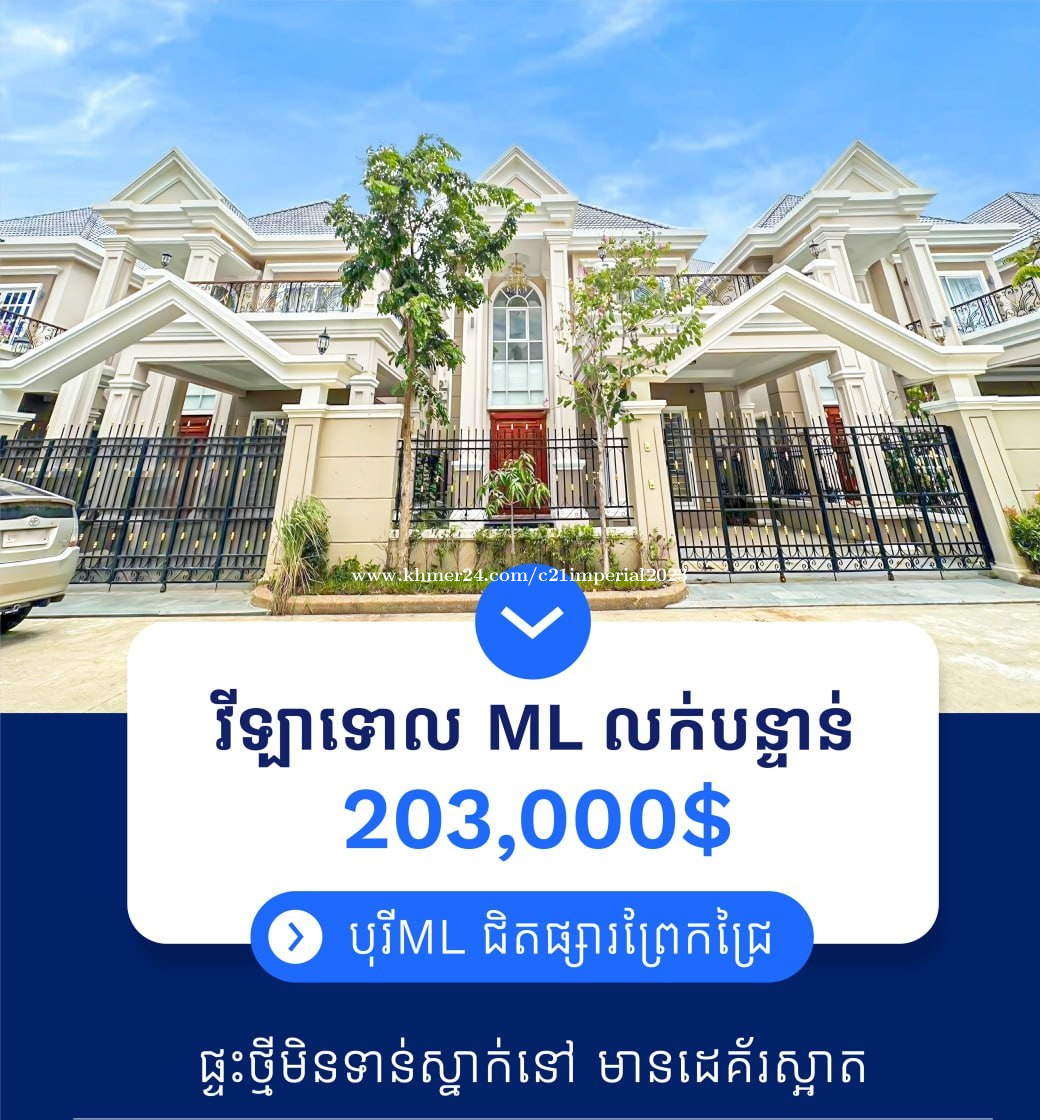 វីឡា ML សម្រាប់លក់ក្នុង (បុរីML ព្រែកជ្រៃ) ✅តម្លៃលក់ : $203,000 ចរចា ✅បន្ទប់គេង : 4 ✅បន្ទប់ទឹក : 4 ✅ទំហំដី : 11m x 21m ✅ទំហំផ្ទះ : 8m x 12m ℹ️សម្រាប់ព័ត៌មានបន្ថែម និងរូបភាពបន្ថែមសូមទំនាក់ទំនងៈ 📞 085222xxxClick To Call / @mengc21imperial