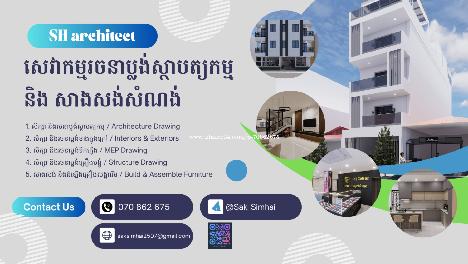 1. សិក្សា និងរចនាប្លង់ស្ថាបត្យកម្ម / Architecture Drawing 2. សិក្សា និងរចនាប្លង់ខាងក្នុងក្រៅ / Interiors & Exteriors 3. សិក្សា និងរចនាប្លង់ទឹកភ្លើង / MEP Drawing 4. សិក្សា និងរចនាប្លង់គ្រឿងបង្គុំ / Structure Drawing 5. សាងសង់ និងដំឡើងគ្រឿងសង្ហាររឹម / Build & Assemble Furniture