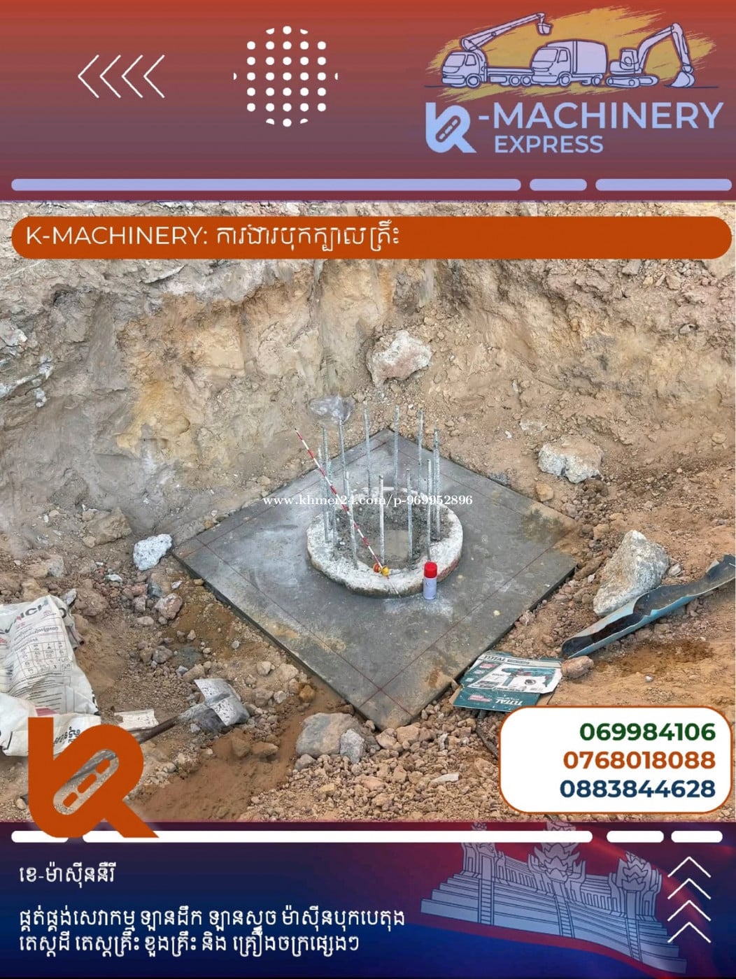K-Machinery យើងខ្ញុំ ផ្តល់សេវាកម្ម ដូចជា: - ឡានដឹកតូចធំ ឡានស្ទូច គ្រប់ប្រភេទ - ចាក់ ដី ថ្ម ខ្សាច់ តាមតម្រូវការ - តេស្តដី ខួងគ្រឹះ តេស្តគ្រឹះ បុកក្បាលគ្រឹះ - រុះរើរអគារ ចាស់ - សិប្បកម្ម ពត់ដែកកង តាមតម្រូវការ យើងផ្តល់ជូន ដៃគូសហការនូវ សេវាកម្មរហ័ស ទំនួលខុសត្រូវខ្ពស់ និង តម្លៃសមរម្យ 👷 សូមទំនាក់ទំនងតាមរយៈ Telegram: 0768018xxxClick To Call 069984xxxClick To Call 0883844xxxClick To Call