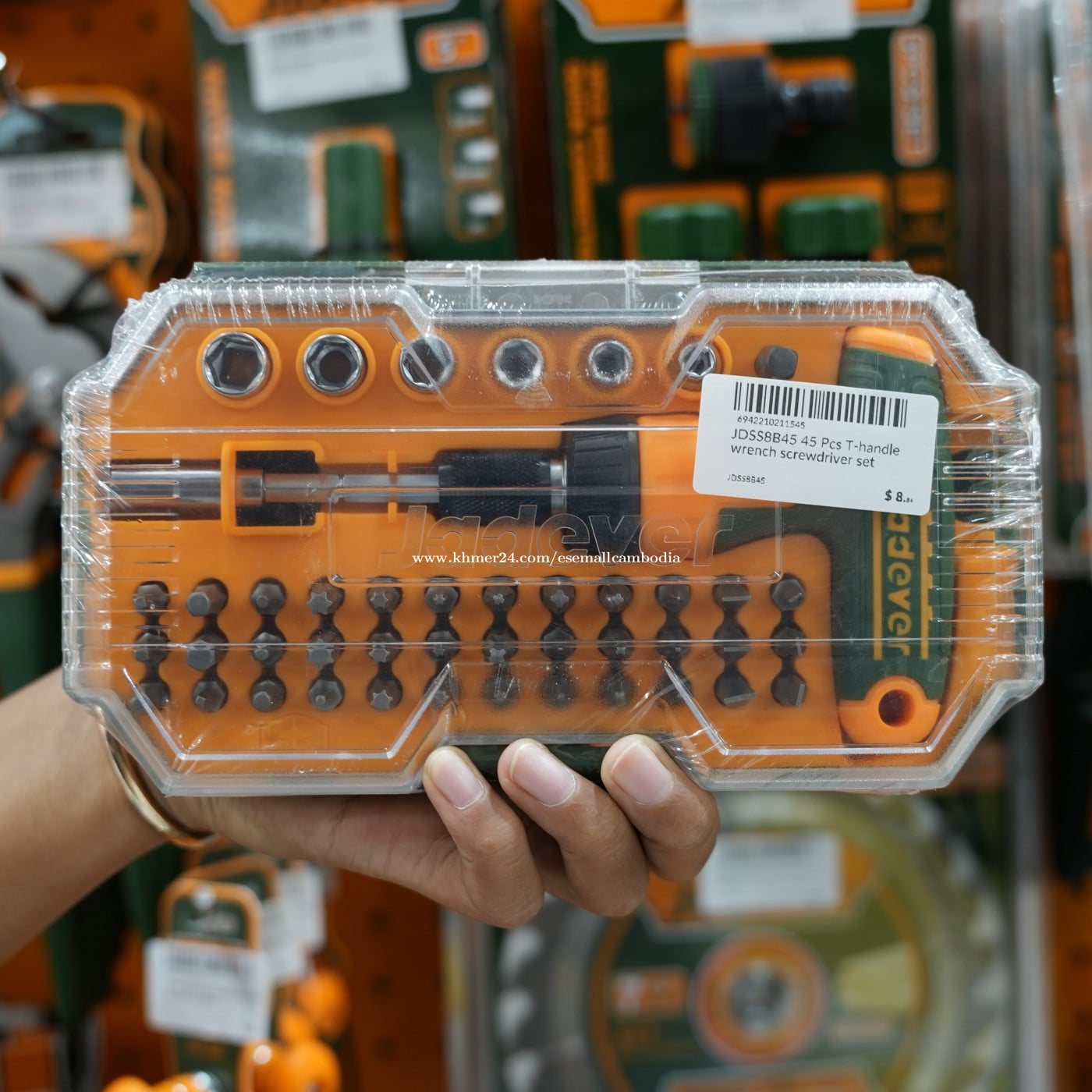 សំណុំទួណឺវីស T-Handle JADEVER 45 ដុំ (T-Handle Wrench Screwdriver Set) (JDSS8B45) 🔧 ប្រភេទ៖ សំណុំទួណឺវីស T-Handle 🏷 ម៉ាក៖ JADEVER 📦 បរិមាណ៖ 45 ដុំ / Set 🆕 សភាព៖ ថ្មី 100% មានប្រអប់ដើម ⭐ ពណ៌នាផលិតផល សំណុំទួណឺវីស T-Handle JADEVER ជាសំណុំឧបករណ៍គ្រប់គ្រាន់ សម្រាប់ការងារដោះ-បិទវីសគ្រប់ប្រភេទ។ រចនាបែប T-Handle កាន់ងាយ ផ្តល់កម្លាំងបងល្អ មិនឈឺដៃ សាកសមសម្រាប់ការងារជាង និងការងារ DIY ប្រចាំថ្ងៃ។ ⭐ មាតិកាក្នុងសំណុំ ដង T-Handle 1 ដុំ ដងបន្ថែម (Extension) ប៊ីតវីសច្រើនប្រភេទ (Phillips, Flat, Torx, Hex, Star… ) ក្បាល Socket ខ្នាតផ្សេងៗ ប្រអប់ផ្ទុករឹងមាំ ងាយរៀបចំ ⭐ លក្ខណៈពិសេស ✅ ដែកគុណភាពខ្ពស់ រឹងមាំ ប្រើបានយូរ ✅ T-Handle ជួយបង្កើនកម្លាំងបង និងការគ្រប់គ្រង ✅ ប៊ីតពេញលេញ ប្រើបានជាមួយវីសជាច្រើនប្រភេទ ✅ ប្រអប់តូច ស្អាត ងាយយកតាមខ្លួន ✅ សាកសមសម្រាប់ការងារលម្អិត និងការងារជាង 🧰 សមស្របសម្រាប់ ជាងម៉ាស៊ីន / ជាងអគ្គិសនី ជាងម៉ូតូ / រថយន្ត ការងារ DIY នៅផ្ទះ រោងជាង និងសិក្ខាសាលា