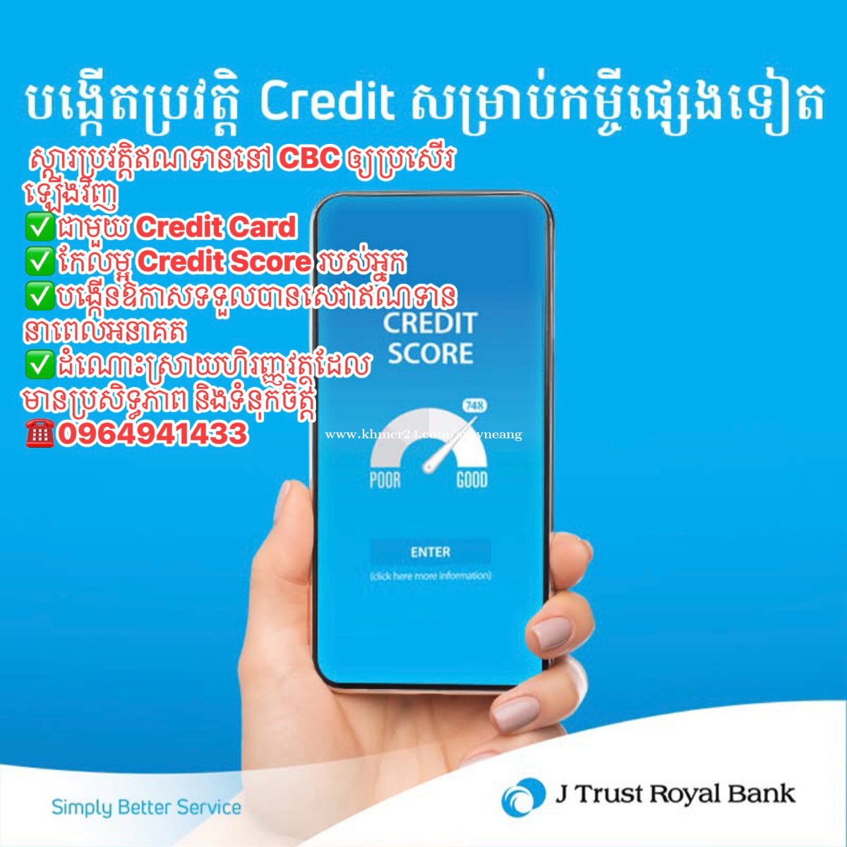 ស្ដារប្រវត្តិឥណទាននៅ CBC ឲ្យប្រសើរឡើងវិញ ✅ជាមួយ Credit Card ✅កែលម្អ Credit Score របស់អ្នក ✅បង្កើនឱកាសទទួលបានសេវាឥណទាននាពេលអនាគត ✅ដំណោះស្រាយហិរញ្ញវត្ថុដែលមានប្រសិទ្ធភាព និងទំនុកចិត្ត ☎️0964941xxxClick To Call J Trust Royal Bank