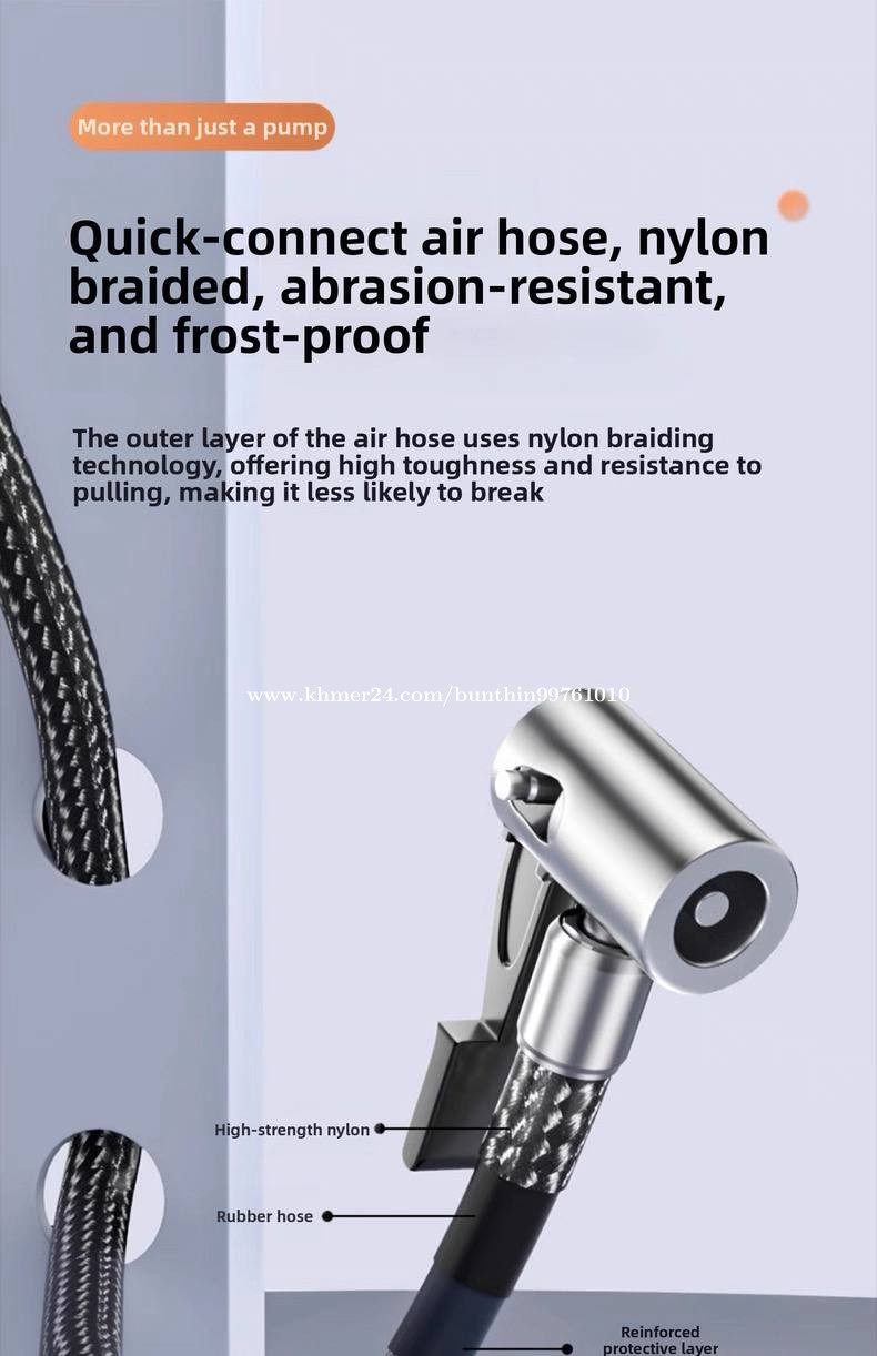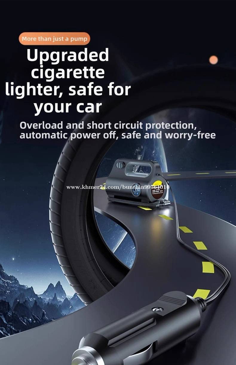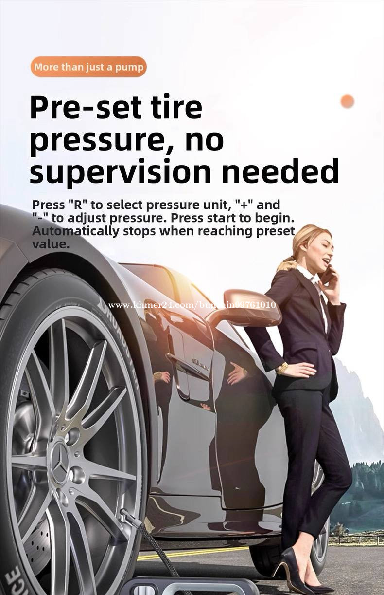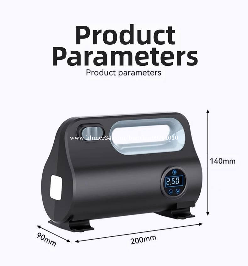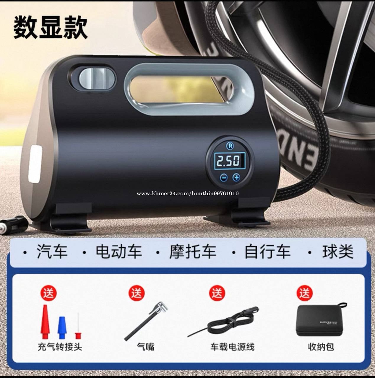 ស្នប់សប់កង់បី ឡាន ម៉ូតូ កង់ Tire Inflator Air Compressor Pump: + ស្នប់សប់កង់បី ឡាន ម៉ូតូ កង់ សប់បានលឿនដែលអាចសប់បាន 22L លីត្រខ្យល់ក្នុង1 នាទី។ + មានថែមជូន កាវញ៉ុកប៉ះកង់ឡានមួយឈុត ប្រើភ្លើង DC ចាប់អាគុយឡាន + កំលាំងខ្យល់ខ្លាំង រហូតដល់ 150PSI 50psi Black Digital Tire Inflator Portable Tire Pump Mini Small Car Air Compressor LED Display Car Air Compressor Tire Inflator * Voltage : 12 V * Material : Plastic * Display Type : digital pressure gauge * Function : Emergency Light, Power Indicator, Tire Pressure Monitor * Size : 20*9*14cm * power : 120W អ្នកលក់ ៖ +855766xxxClick To Call 449 (តេលេក្រាម)