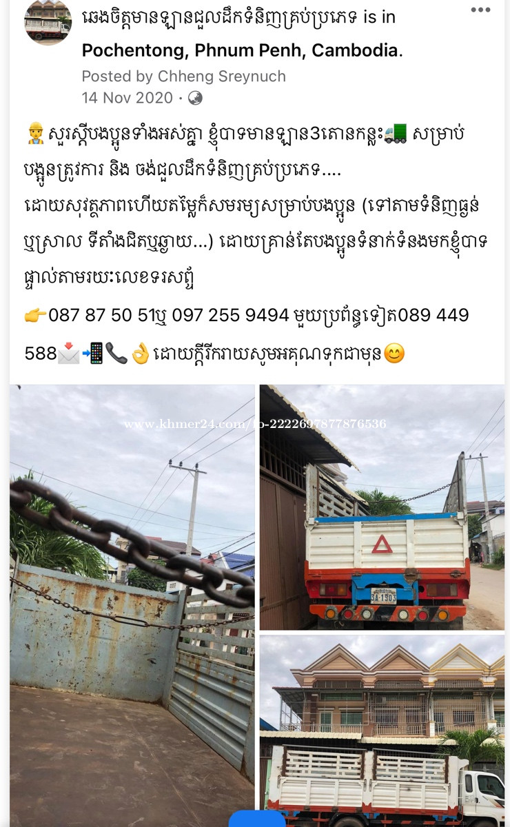 👷សួរស្ដីបងប្អូនទាំងអស់គ្នា ខ្ញុំបាទមានឡាន3តោនកន្លះ🚛 សម្រាប់បង្អូនត្រូវការ និង ចង់ជួលដឹកទំនិញគ្រប់ប្រភេទ.... ដោយសុវត្ថភាពហើយតម្លៃក៏សមរម្យសម្រាប់បងប្អូន (ទៅតាមទំនិញធ្ងន់ឬស្រាល ទីតាំងជិតឬឆ្ងាយ...) ដោយគ្រាន់តែបងប្អូនទំនាក់ទំនងមកខ្ញុំបាទផ្ទាល់តាមរយៈលេខទរសព្ទ័ 👉087875xxxClick To Callឬ 0972559xxxClick To Call មួយប្រព័ន្ធទៀត089449xxxClick To Call📩📲📞👌ដោយក្ដីរីករាយសូមអគុណទុកជាមុន😊