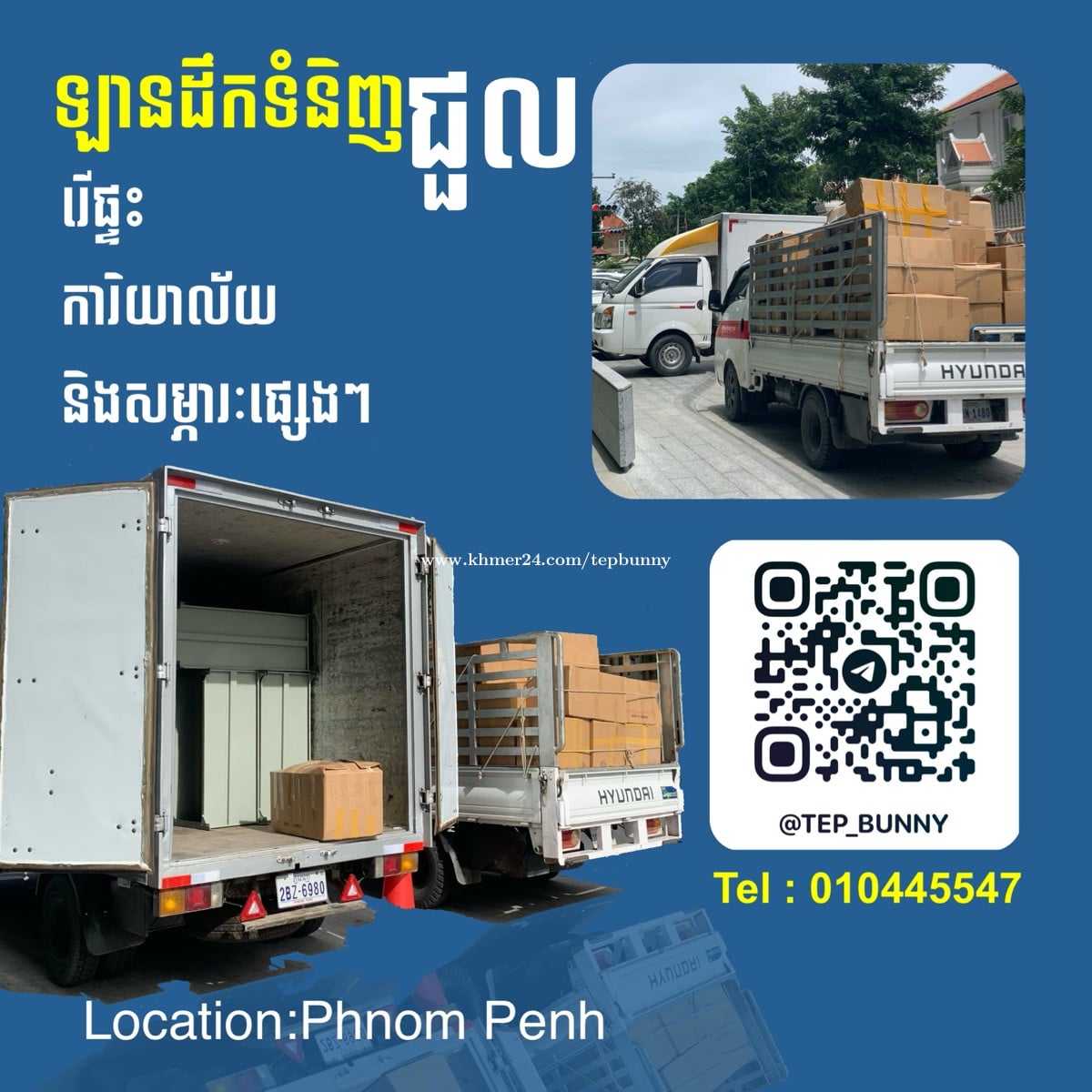 🚚ឡានដឹកជញ្ជូនទំនិញ រើផ្ទះ គ្រឿងសង្ហារឹម ✅ការិយាល័យនិងសម្ភារះតូចធំគ្រប់ប្រភេទ ✅ដោះតម្លើង សម្ភារៈគ្រប់ប្រភេទ ទូរ តុ គ្រែ ។ 📞ទំនាក់ទំនង : 010445xxxClick To Call / 012366xxxClick To Call 📲តេលេក្រាម : https://t.me/Tep_Bunny 📍ទីតាំង : ភ្នំពេញ 🚚Cars for moving goods, moving houses, furniture ✅Office and all kinds of small and large equipment ✅Dismantling and installing all kinds of equipment, TV, table, bed. 📞Contact: 010445xxxClick To Call / 012366xxxClick To Call 📲Telegram: https://t.me/Tep_Bunny 📍Location: Phnom Penh 🚚Xe chở hàng, chuyển nhà, chuyển đồ đạc ✅Văn phòng và các loại thiết bị lớn nhỏ ✅Tháo lắp các loại thiết bị, tivi, bàn, giường. 📞Liên hệ: 010445xxxClick To Call / 012366xxxClick To Call 📲Telegram: https://t.me/Tep_Bunny 📍Địa điểm: Phnom Penh