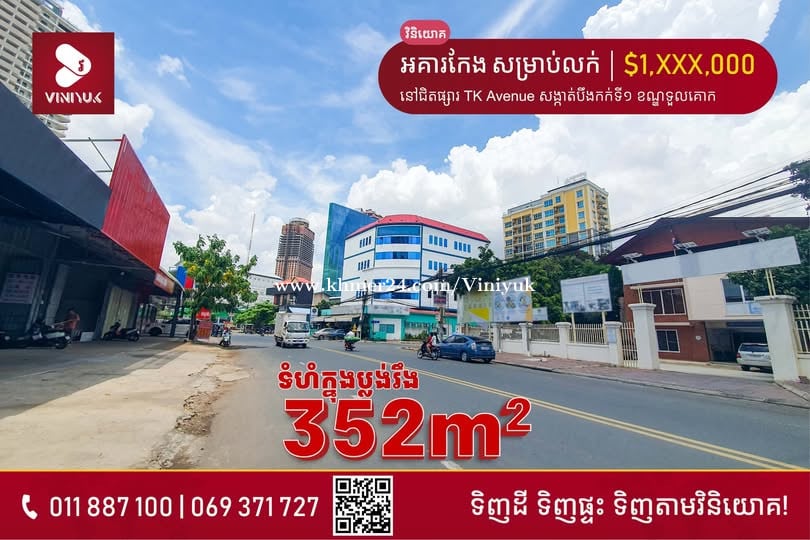 🏡អគារកែង សម្រាប់លក់!! 📍ទីតាំង ៖ នៅជិតផ្សារ TK Avenue សង្កាត់បឹងកក់ទី១ ខណ្ឌទួលគោក - តម្លៃលក់ : $1,700,000 ចរចា - ទំហំក្នុងប្លង់រឹង : 352m2 - ទំហំអាគារ : 14m x 19m - មានបន្ទប់ 18 - មានជណ្តើរយន្ត 1 - មានចំណូលពីការជួលស្រាប់ - ប័ណ្ណកម្មសិទ្ធិប្លង់រឹង