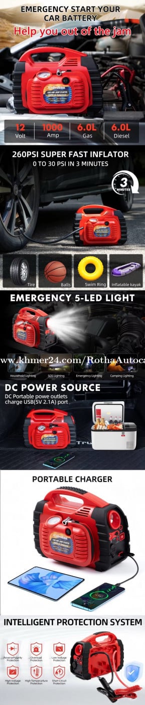 ប្រើបានចើនមុខងារ ប៉ះកង់ឡាន ថ្លឹងខ្យល់កង់ឡាន ក។ គូវអាគុយឡាន មានភ្លើងបំភ្លឺ និងមានមុខងារជាច្រើនទៀត ផលិតផលនេះ លក់លាងស្តុក តម្លៃពេញ145$ ទិញឥលូវនេះលក់ជូនតែ85$ប៉ុណ្ណោះ.!
