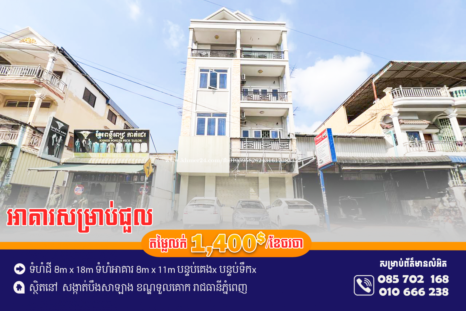 អាគារសម្រាប់ជួល ស្ថិតនៅម្តុំបឹងសាឡាង អាគារនៅថ្មីស្អាត អាចបើកអាជីវកម្មបានតាមចិត្តចង់ 📍ទីតាំងស្ថិនៅ សង្កាត់បឹងសាឡាង ខណ្ឌទួលគោក ភ្នំពេញ ◈━━━━━━━━━━━━◈ តម្លៃជួល| Rent Price $1,400/ខែ ចរចា ទំហំអាគារ 8m x 11m(កំពស់3ជាន់) បន្ទប់គេង x បន្ទប់ទឹកx ◈━━━━━━━━━━━━◈ 📍សូមចូលទៅកាន់𝗧𝗲𝗹𝗲𝗴𝗿𝗮𝗺 𝗖𝗵𝗮𝗻𝗻𝗲𝗹ពេលនេះ ដើម្បីស្វែងរកអចលនទ្រព្យពិសេសផ្សេងទៀត៖ 🔗 𝐓𝐞𝐥𝐞. 𝐂𝐡𝐚𝐧𝐧𝐞𝐥:𝗵𝘁𝘁𝗽𝘀://𝘁.𝗺𝗲/𝗦𝗼𝗸𝗵𝗮𝗶𝗥𝗲𝗮𝗹𝘁𝘆 ☎️ 𝗧𝗲𝗹𝗲𝗴𝗿𝗮𝗺:𝟬𝟭𝟬 𝟲𝟲𝟲 𝟮𝟯𝟴 ☎️ 𝗧𝗲𝗹𝗲𝗴𝗿𝗮𝗺:𝟬𝟴𝟱 𝟳𝟬𝟮 𝟭𝟲𝟴