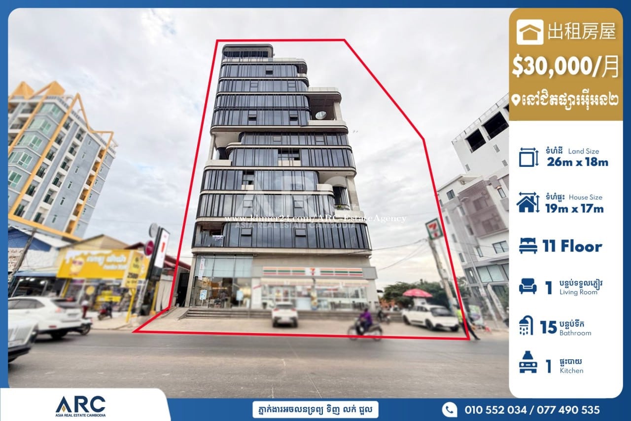 អាគារជួលស្ថិតនៅជិតផ្សារអុីអន២ Building For Rent Near Aeon2 🏷 ជួល/ 售價 $30,000 (ចចារ) 🏷 ទំហំដី土地面積 26x18m 🏷 អាគារ建筑面积 19x17m 🏷 កំពស់ /臥室 : 11 Floor 🏷 បន្ទប់ទឹក / 浴室 : 15 🏷 ជាន់នីមួយៗ Open Space 🏷 អាគារនៅថ្មីនិងមានការរៀបចំបែប Premier 🏷 អាគារជួលសម្រាប់ ធនាគារ ការិយាល័យធ្វើការ ភោជនីយដ្ឋាន និង សណ្ឋាគារ -ល- 📍ទីតាំងអាគារជួលស្ថិតនៅនៅជិតផ្សារអុីអន២ ខណ្ឌសែនសុខ រាជធានីភ្នំពេញ Chat to Agent/ 聊天到電報: 010552xxxClick To Call/077490xxxClick To Call Telegram https://t.me/ARCNhemBontheaSensok Channel Telegram https://t.me/ARCMrBonthea អាជ្ញាប័ណ្ណ៖ EV-08-069