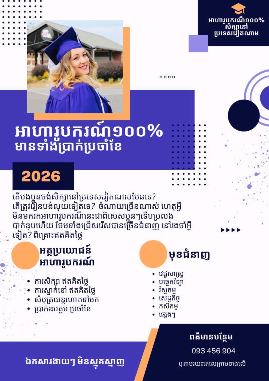 សិក្សាថ្នាក់បរិញ្ញាបត្រ - ផ្តល់ប្រាក់ខែរហូតដល់រៀនចប់ - មានច្រើនជំនាញក្នុងការជ្រើសរើស - សិក្សាឥតគិតថ្លៃ - ស្នាក់នៅឥតគិតថ្លៃ - ផ្តល់សំបុត្រយន្តហោះទៅមក - អត្ថប្រយោជន៍ផ្សេងទៀត ពត៌មានបន្ថែមតេលេក្រាម 093456xxxClick To Call