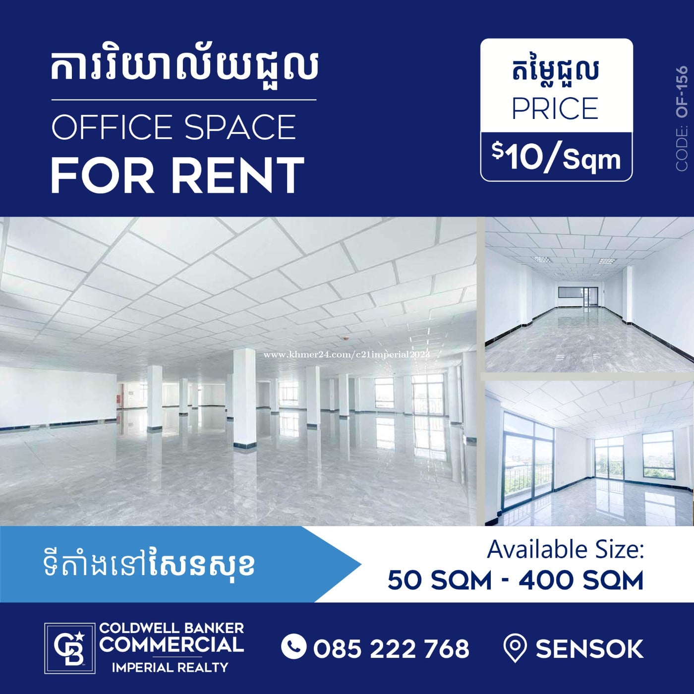 Office for rent at Khan Sensok (OF-156) -Available Size : 50 sqm , 55sqm , 100sqm , 150sqm , 170sqm 200sqm , 250sqm , 300sqm , 400sqm -Price : 10$/sqm -Contract : 1year to 3 years - Deposit : 3 months - Advance : 1 month - Water : free -Management fee : free -Parking : Free Additional Parking Fee 50$/car , 5$/motor -Vat excluded - Good location in central of cit.
