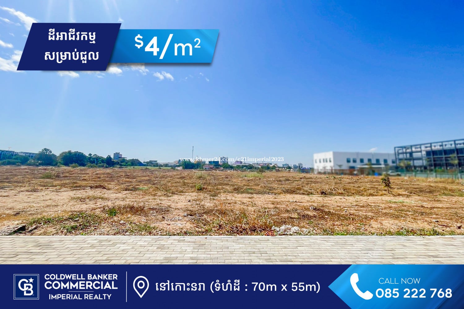 -តម្លៃជួល : $4/មួយម៉ែត្រការ៉េ -ទំហំដី : 70m x 55m -ទំហំក្នុងប្លង់ : 3850m² -កុងត្រារយះពេល5ឆ្នាំឡើង ✨ទីតាំងនៅក្នុងកោះនរា អាចជួលសម្រាប់ធ្វើទីតាំងអាជីវកម្មផ្សេងៗបាន។ ✉️សម្រាប់ព័ត៌មានលំអិត និងរូបភាពបន្ថែមសូមទំនាក់ទំនងៈ ☎️ 085222xxxClick To Call (Telegram) ☎️ 069993xxxClick To Call 🔗Telegram : https://t.me/imperialcomercial 🌐Website : https://imperialrealty.com.kh #ColdwellBankerCambodia✅✅✅