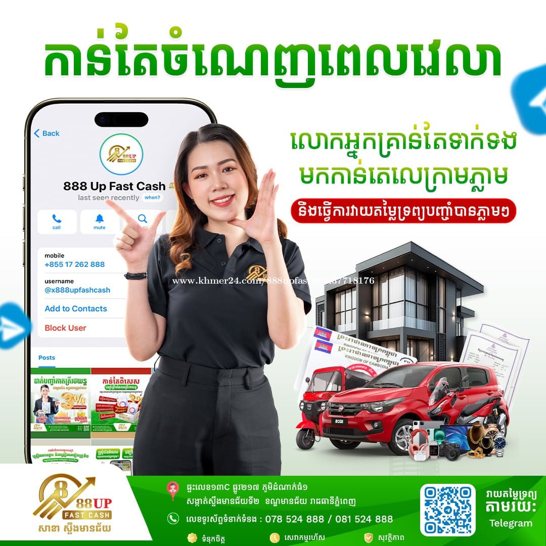 [English & 中文 Below ] ✨ កាន់តែចំណេញពេលវេលា! វាយតម្លៃទ្រព្យបញ្ចាំរបស់អ្នកតាម Telegram ✨ ✅ ងាយៗ រហ័សទាន់ចិត្តដោយមិនចាំបាច់មកដល់ទីតាំង ✅ អត្រាការប្រាក់ទាប ✅ អនុម័តលឿន ស្នេីបានសាច់ប្រាក់ខ្ពស់ ✅ រក្សាការសម្ងាត់អតិថិជន 100% ---------------------------------- ✨ Save More Time! Get Your Asset Assessed via Telegram! ✨ ✅ Easy and Fast—no need to visit our physical location ✅ Low Interest Rate ✅ Fast Approval, request high cash amount ✅ 100% Customer Confidentiality is maintained ---------------------------------- ✨ 节省更多时间!通过 Telegram 评估您的抵押资产!✨ ✅ 简单快捷 — 无需亲自前往门店 ✅ 低利率 ✅ 快速审批,可申请高额现金 ✅ 100% 保护客户隐私 📌អាសយដ្ឋាន/Address: House No. A14, National Road No. 4, Ou Derm Village, Chamchao 3 Sangkat, Pou Senchey District, Phnom Penh. 📍ទីតាំងហាង/Location : GOOGLE MAP (https://maps.app.goo.gl/nB5FmGCngYg1qwmg8) 📲ព័ត៌មានបន្ថែម/More info click here : CHANNEL (https://t.me/cc888upfastcashchannel) 📈វាយតម្លៃចុចទីនេះ/Quick assessment click here: TELEGRAM (https://t.me/cc888upfastcash) 🌐Website: 888UPFC.COM ☎️ Tel : 069824xxxClick To Call / 085824xxxClick To Call #PawnShop #888UpFastCash #PawnShopFinds #LowInterestRate