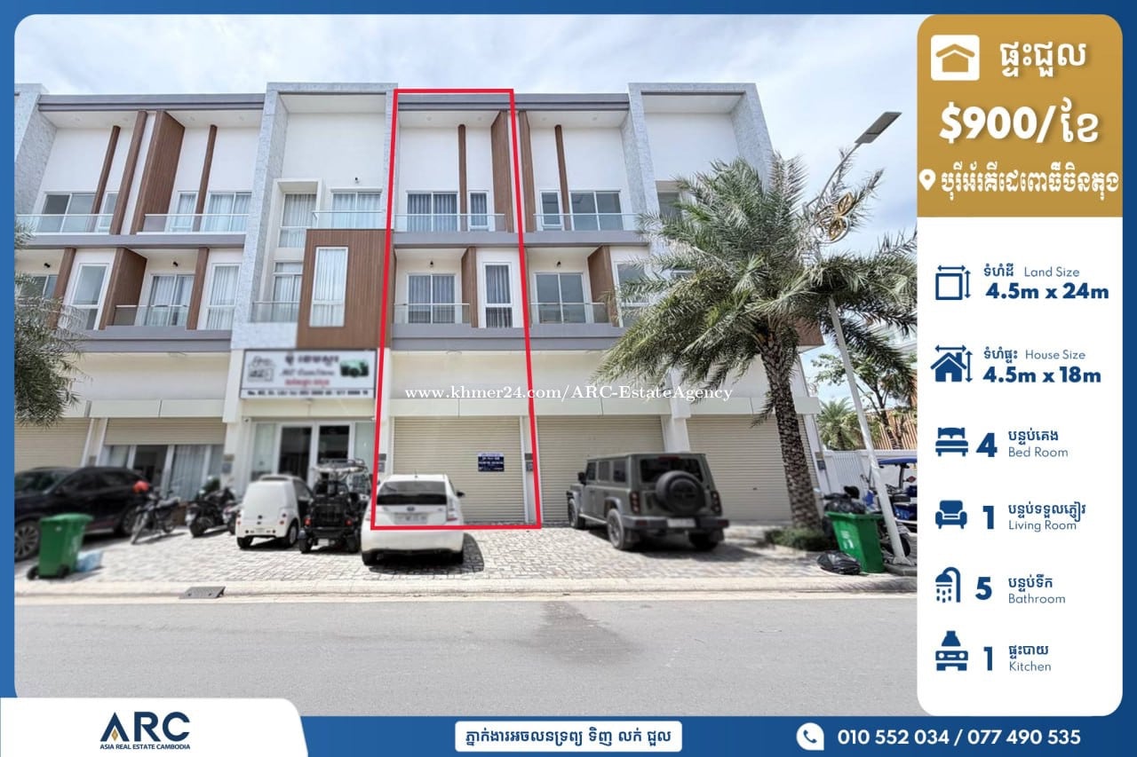 ផ្ទះអាជីវកម្មសម្រាប់ជួលសម្រាប់ជួលស្ថិតនៅបុរីអ័រគីដេនៅមុខប្រលានយន្តហោះពោធិ៏ចិនតុង 靠近机场 🏷 តម្លៃជួល / 售價 $900 🏷 ទំហំដី / 土地面積: 4.5m x 24m 🏷 បន្ទប់គេង /臥室 : 4 🏷 បន្ទប់ទឹក / 浴室 : 5 📍ទីតាំងផ្ទះជួលស្ថិតនៅបុរីអ័រគីដេនៅមុខប្រលានយន្តហោះពោធិ៏ចិនតុង ខណ្ឌសែនសុខ រាជធានីភ្នំពេញ Chat to Agent/ 聊天到電報: 010552xxxClick To Call/077490xxxClick To Call Telegram https://t.me/ARCNhemBontheaSensok Channel Telegram https://t.me/ARCMrBonthea Channel Telegram ARC: https://t.me/AsiaRealEstateCambodia Website: www.arc.com.kh អាជ្ញាប័ណ្ណ៖ EV-08-069
