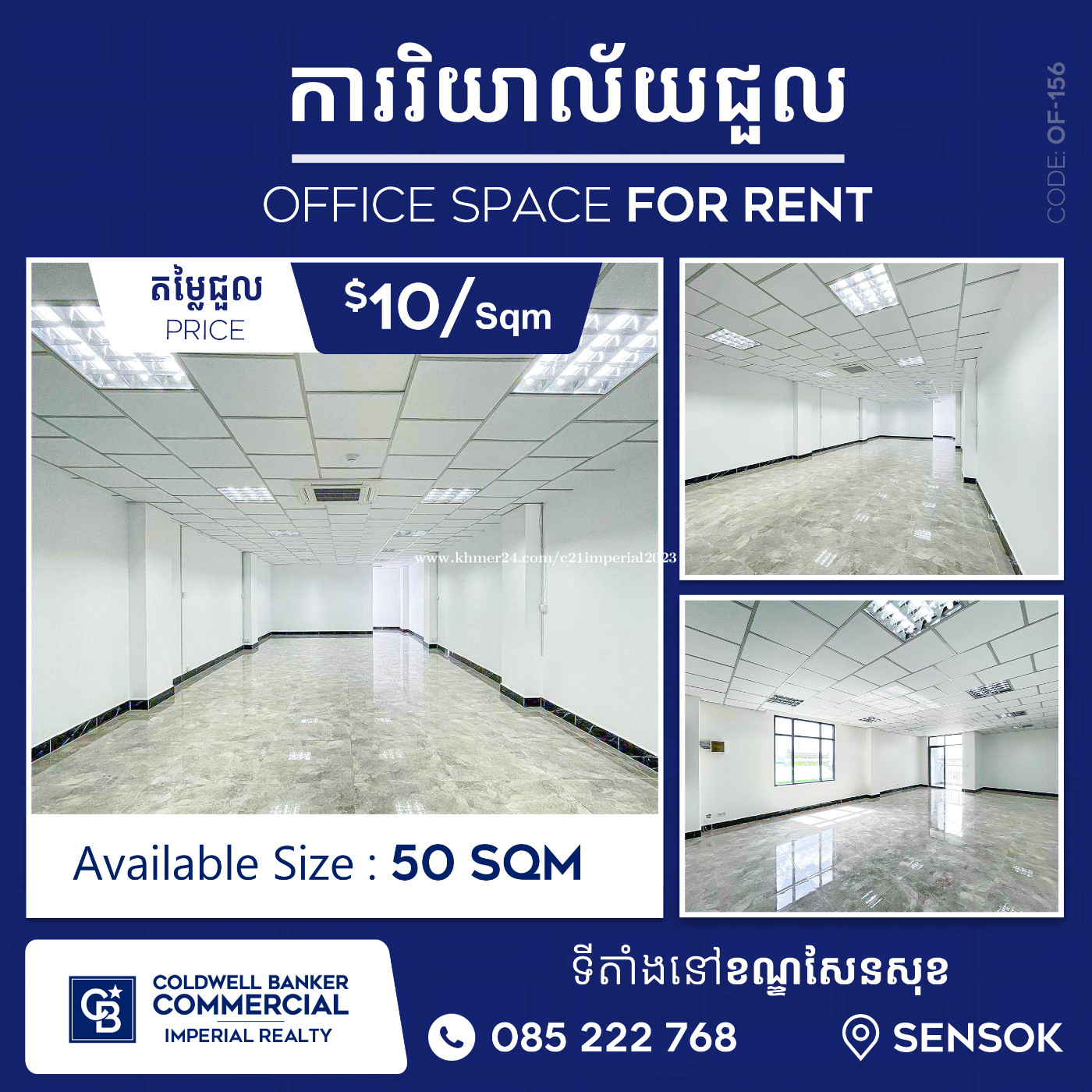-Available Size : 50 sqm -Price : 10$/sqm -Contract : 1year to 3 years - Deposit : 3 months - Advance : 1 month - Water : free -Management fee : free -Parking : Free Additional Parking Fee 50$/car , 5$/motor -Vat excluded - Good location in central of cit. โโโโโโโโโโโโโโโโโโโโโโโโโโ โ๏ธแแแแแถแแแแแแแแถแแแแขแทแ แแทแแแผแแแถแแแแแแแแแผแแแแแถแแแแแแแ โ๏ธ 085222xxxClick To Call (Telegram) โ๏ธ 069993xxxClick To Call ๐Telegram : https://t.me/imperialcomercial ๐Website : https://imperialrealty.com.kh #ColdwellBankerCambodia