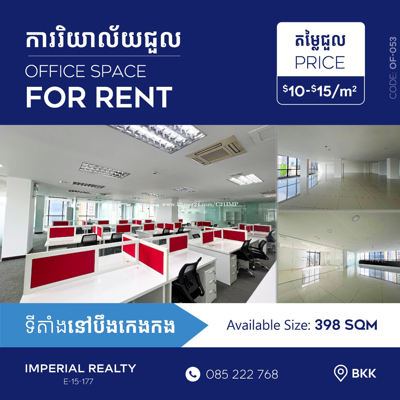 Available size : 398sqm -Price : empty space 10$/sqm Partial Decor 12$/ sqm Fully Decor 15$/sqm -The office space is located the central of CBD , Comfortabel , and good for logistics , financial . ----------- -Contract : 3 years up to 5 years -Deposit : 3 month (3 year contract ) -Electricity : $0.30/kwh -Parking : 3 car , 15 motorbike , -Water fee : free -Security -Vat : excluding