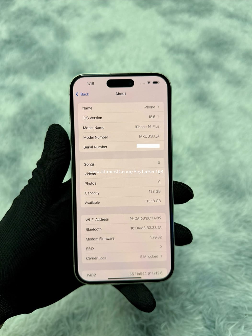 📱iPhone 16 Plus មួយទឹក Color White 🤍 128G lock sim ថ្ម100%🔋 ប្រើបានសុីម2សេវាដើរស្មូតល្អគ្រប់ប្រពន្ធ័⭐️តម្លៃល្អ 🛍️🎁Free Caseការពារ , Screenការពារ , ឆ្នាំងសាក Anker ,ខ្សែរសាកOriginal លែន 👍អ្វីដែលអ្នកឃើញគឺជាអ្វីដែលអ្នកទទួលបាន អីវ៉ាន់នៅក្នុងរូបយ៉ាងម៉េច នៅក្រៅគឺយ៉ាងនោះ។ 👉ធានាលើ ថាច់ និងម៉ាស៊ីន ១ខែ 📍ទីតាំង ទឹកល្អក់៣ ទួលគោក ភ្នំពេញ ☎️Tell:086908xxxClick To Call Telegram ☎️Tell:0888708xxxClick To Call Telegram: https://t.me/BSL_phone Channel: https://t.me/iPhoneBSL