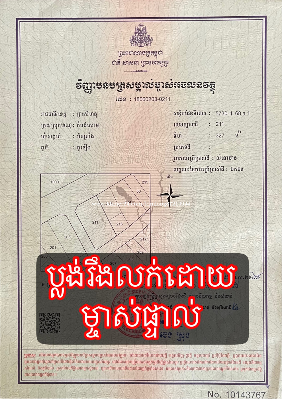 •ដីសម្រាប់លក់មានប្លង់រឹង •តម្លៃ: 220000$ (តម្លៃចរចាបាន) •ទីតាំង: ភូមិពូធឿន, ស្រុកបិតត្រាំង, ខេត្តព្រះសីហនុ •ទំហំ: 327 ម៉ែតការ៉េ, ក្បាលប្រហែល: 14.22m បណ្ដោយ: 23m •ដីស្ថិតនៅកន្លែងទីប្រជុំជនជិត: សាលារៀន, វត្តអារាម, សាលាឃុំសង្កាត់, រោងចក្រ, អាចលក់ដូរបាន •លេខទូរស័ព្ទម្ចាស់ដីផ្ទាល់: 087867xxxClick To Call (Smart) 0714848xxxClick To Call (Metfone) •Telegram: https://t.me/G9_SENPAI •ប្រសិនលោកអ្នកទាក់ទងមកសូមបញ្ជាក់ប្រាប់ថាមកពី Khmer 24